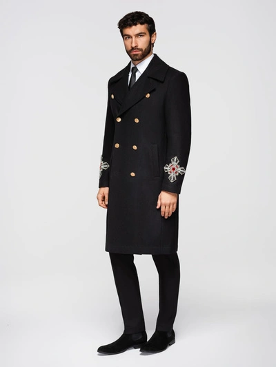 Pánský dvouřadový vlněný kabát s ozdobnými aplikacemi - černý V1 OM-COWC-0147
