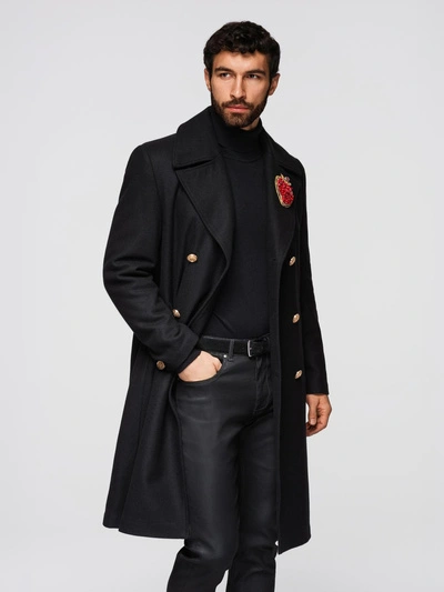 Men's double-breasted coat with wool and bead appliqués on sleeves - black V1 OM-COWC-0148