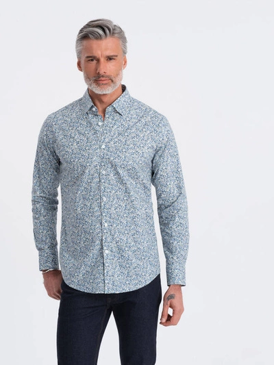 Men's SLIM FIT shirt in small leaf print - light blue V1 OM-SHPS-0163