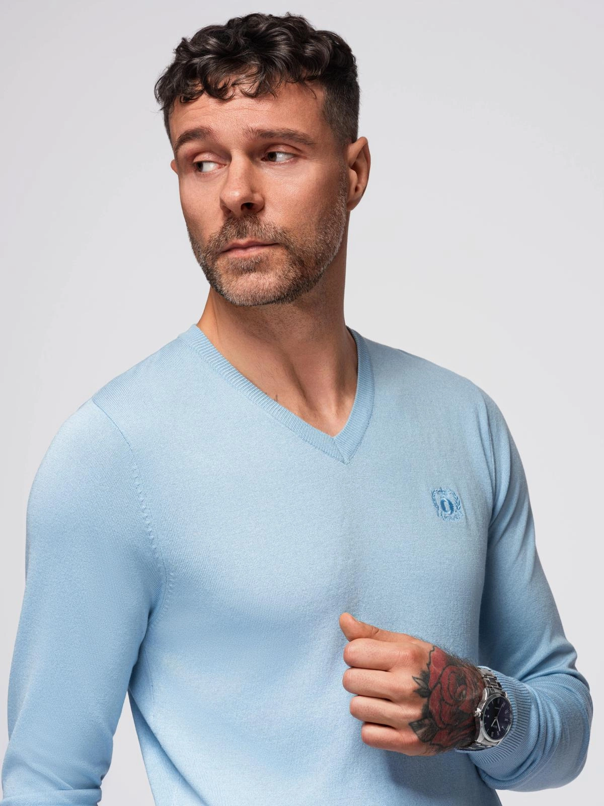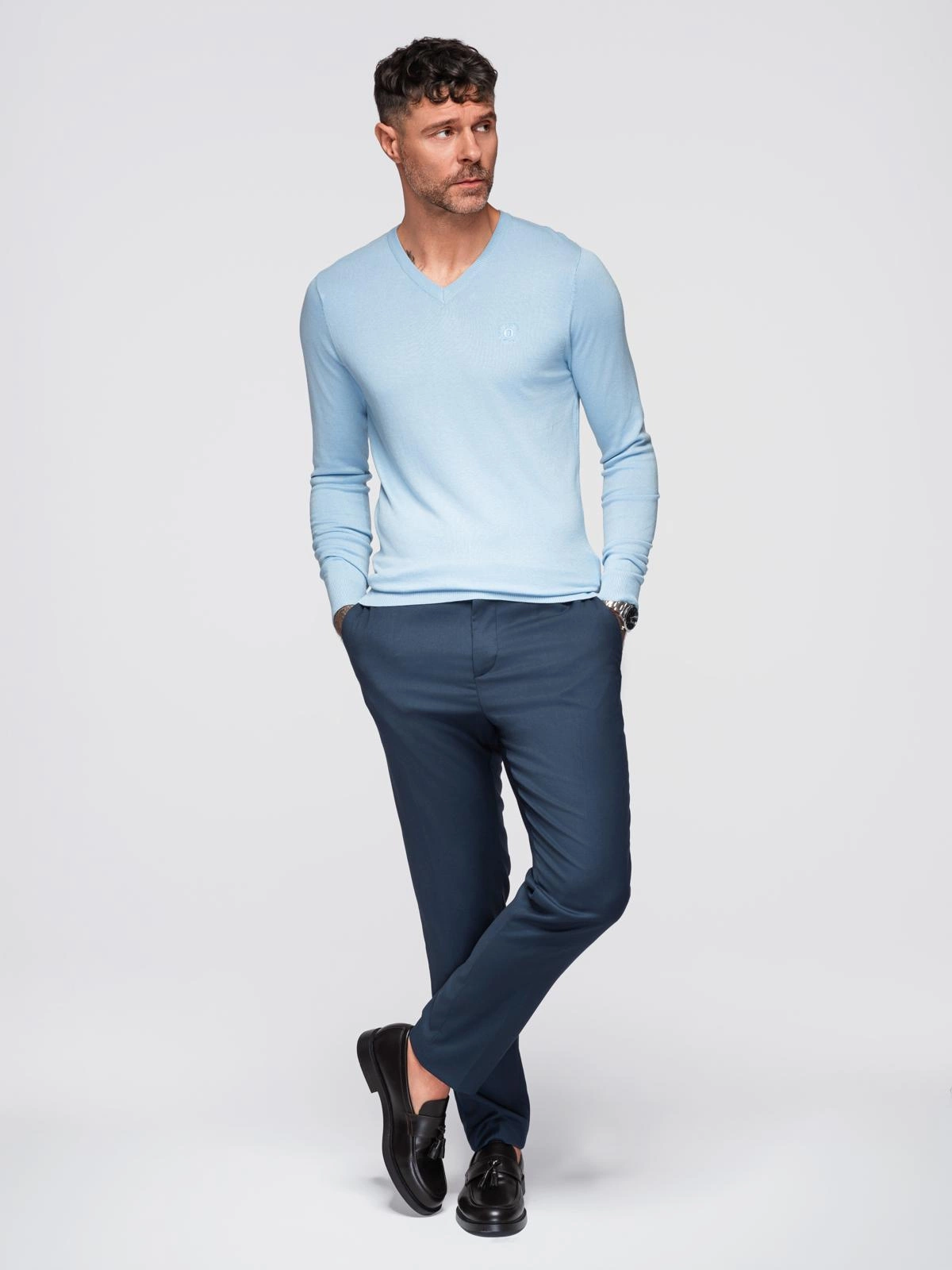 Elegantní pánský svetr s výstřihem - světle modrý V10 OM-SWBS-0107