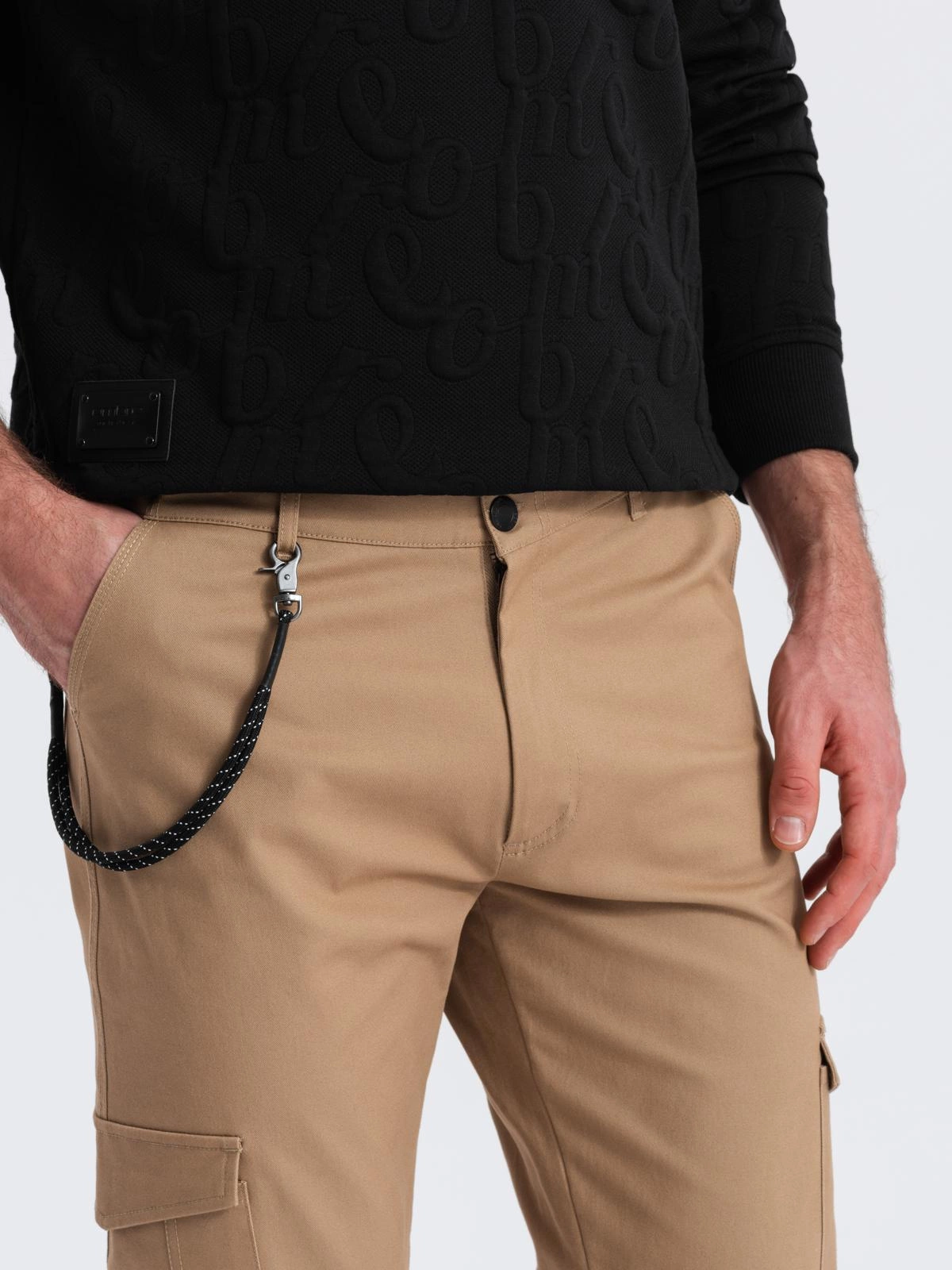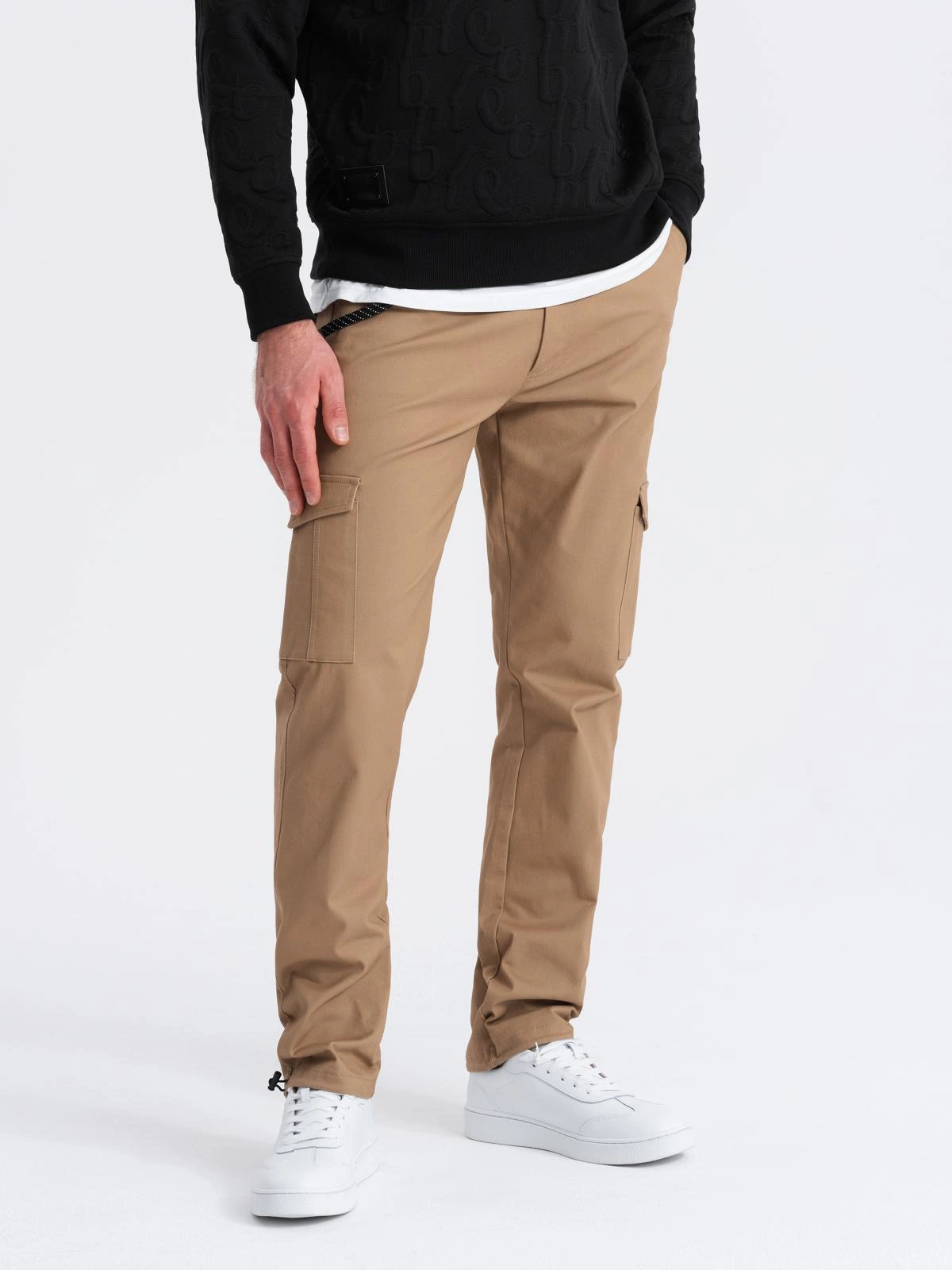 Pánské kalhoty s cargo kapsami a lemem nohavic - teplá hnědá V2 OM-PACG-0189