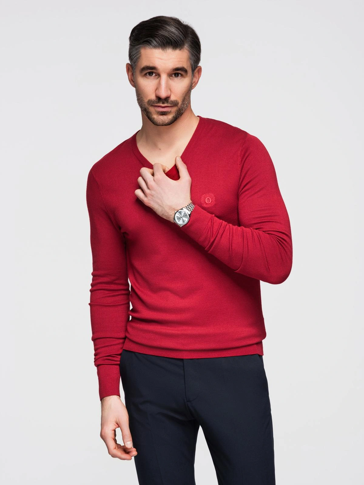 Pánský elegantní svetr BASIC s výstřihem do V a viskózou - červený V20 OM-SWBS-0107