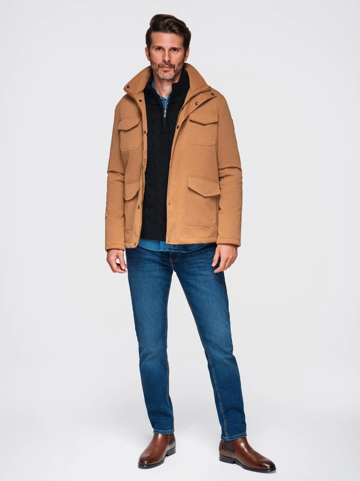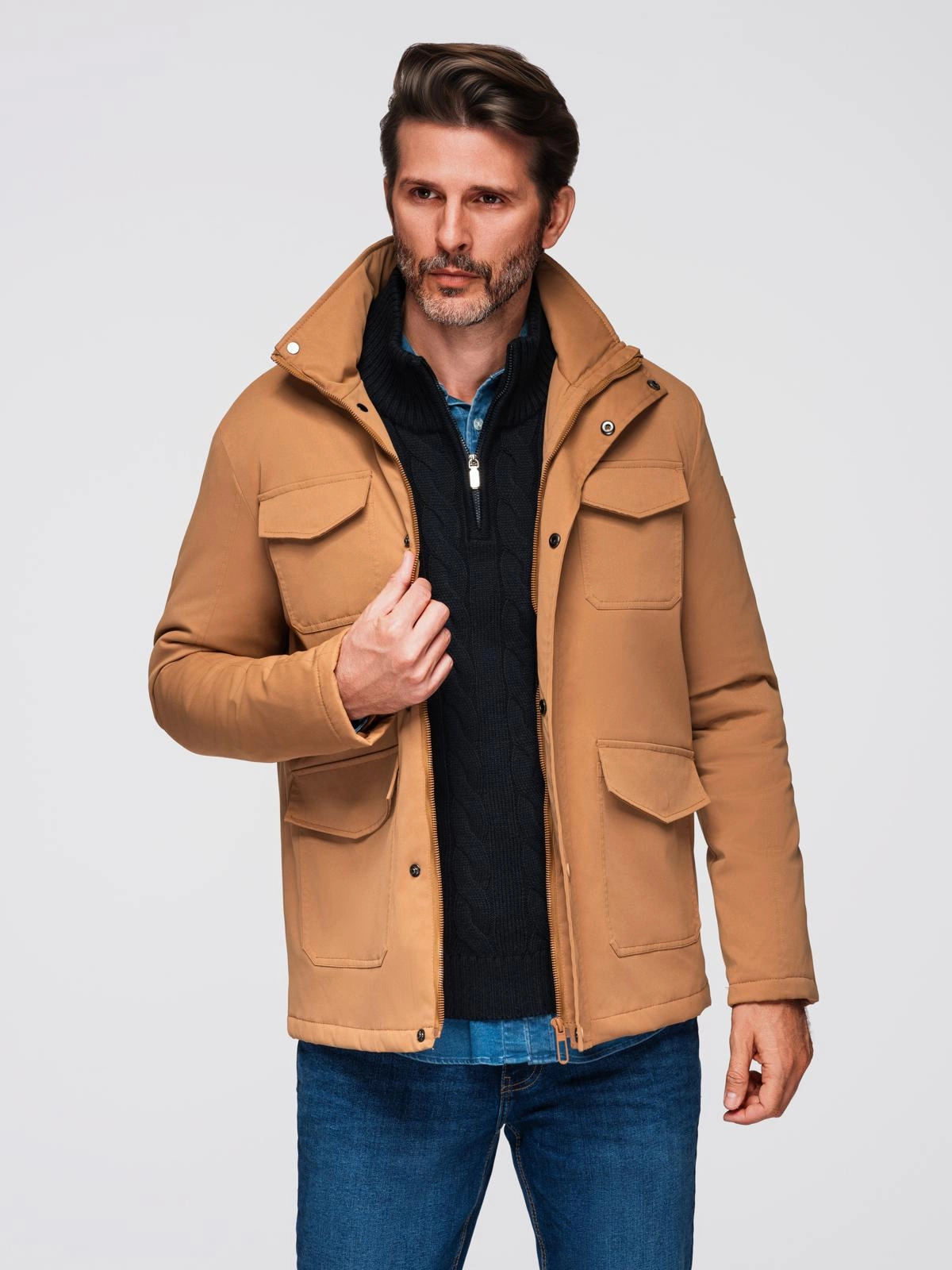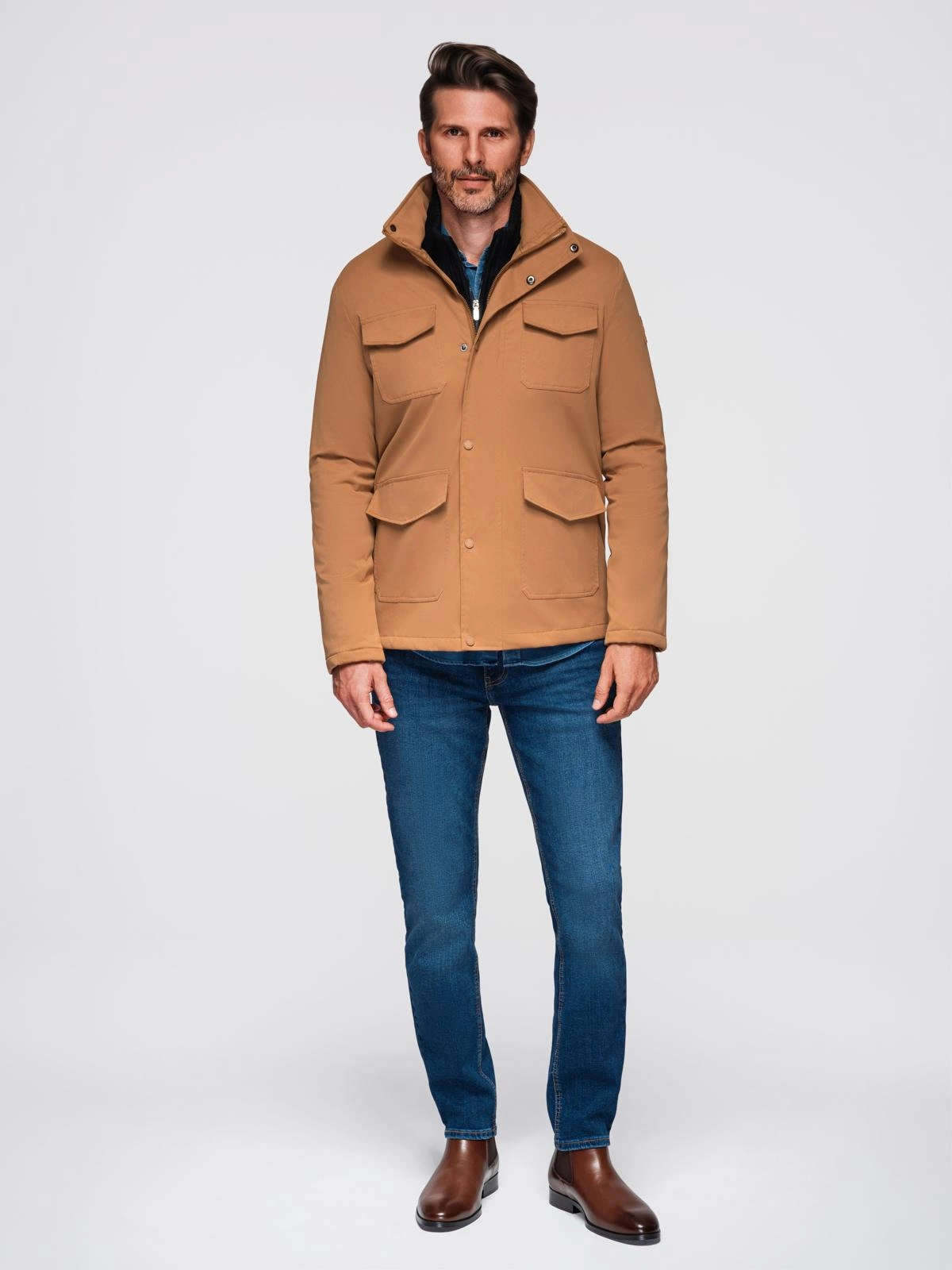 Pánská lehká bunda s kapsami a vysokým límcem - hnědá V5 OM-JALP-0167