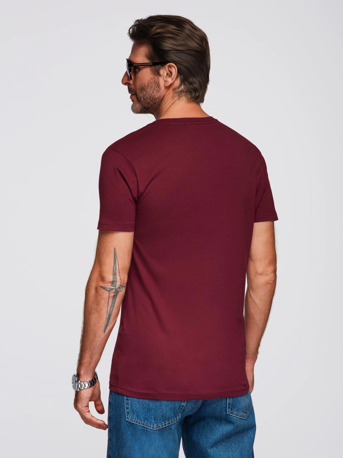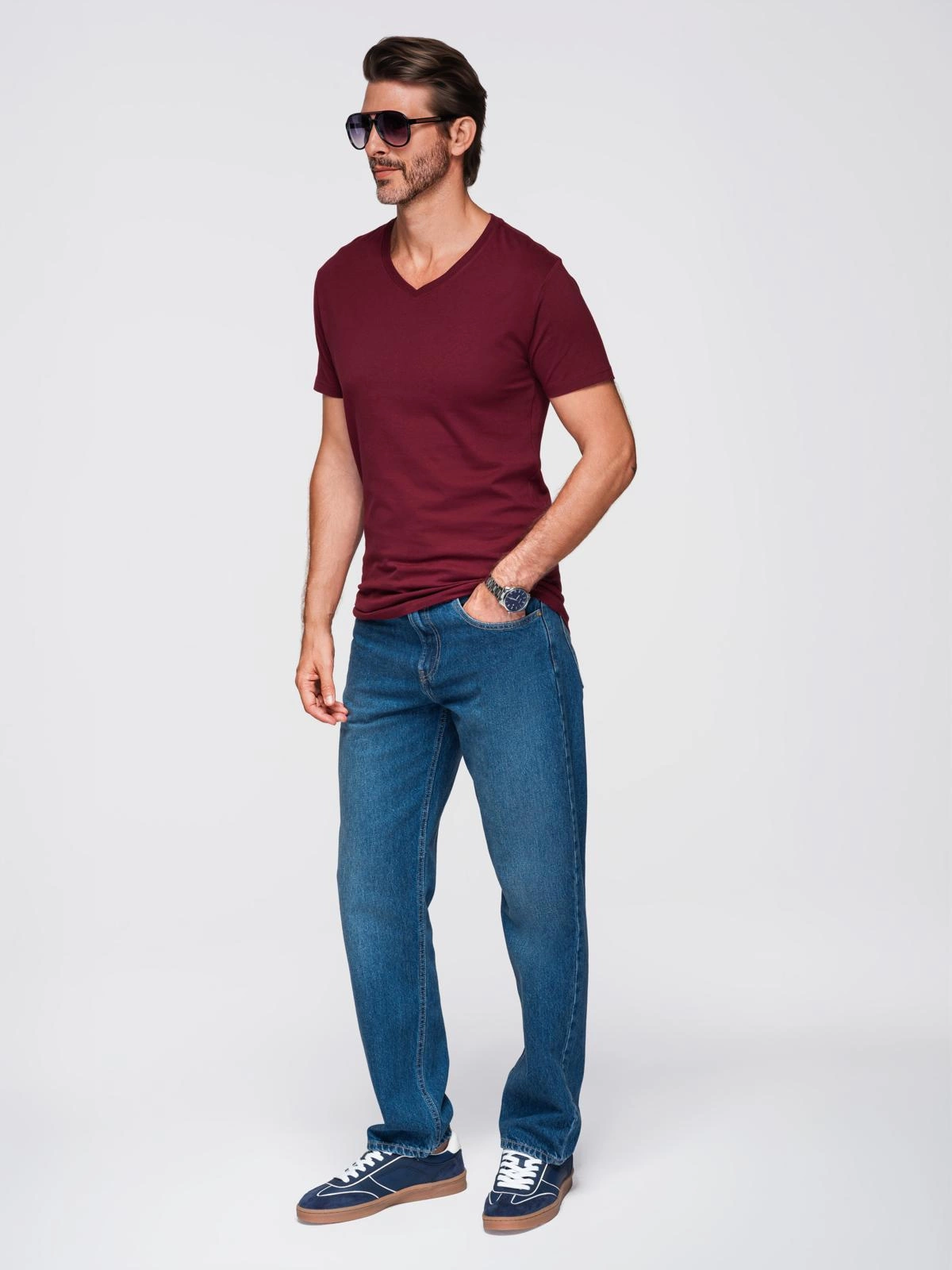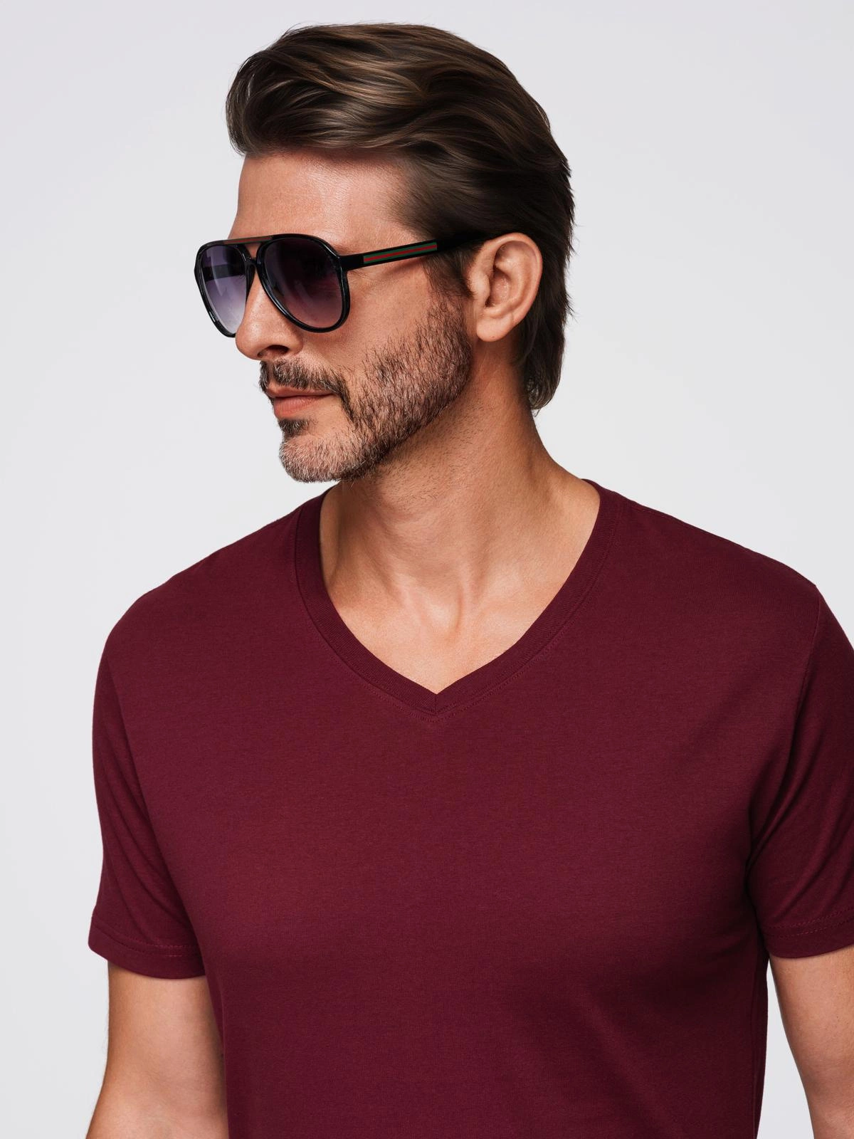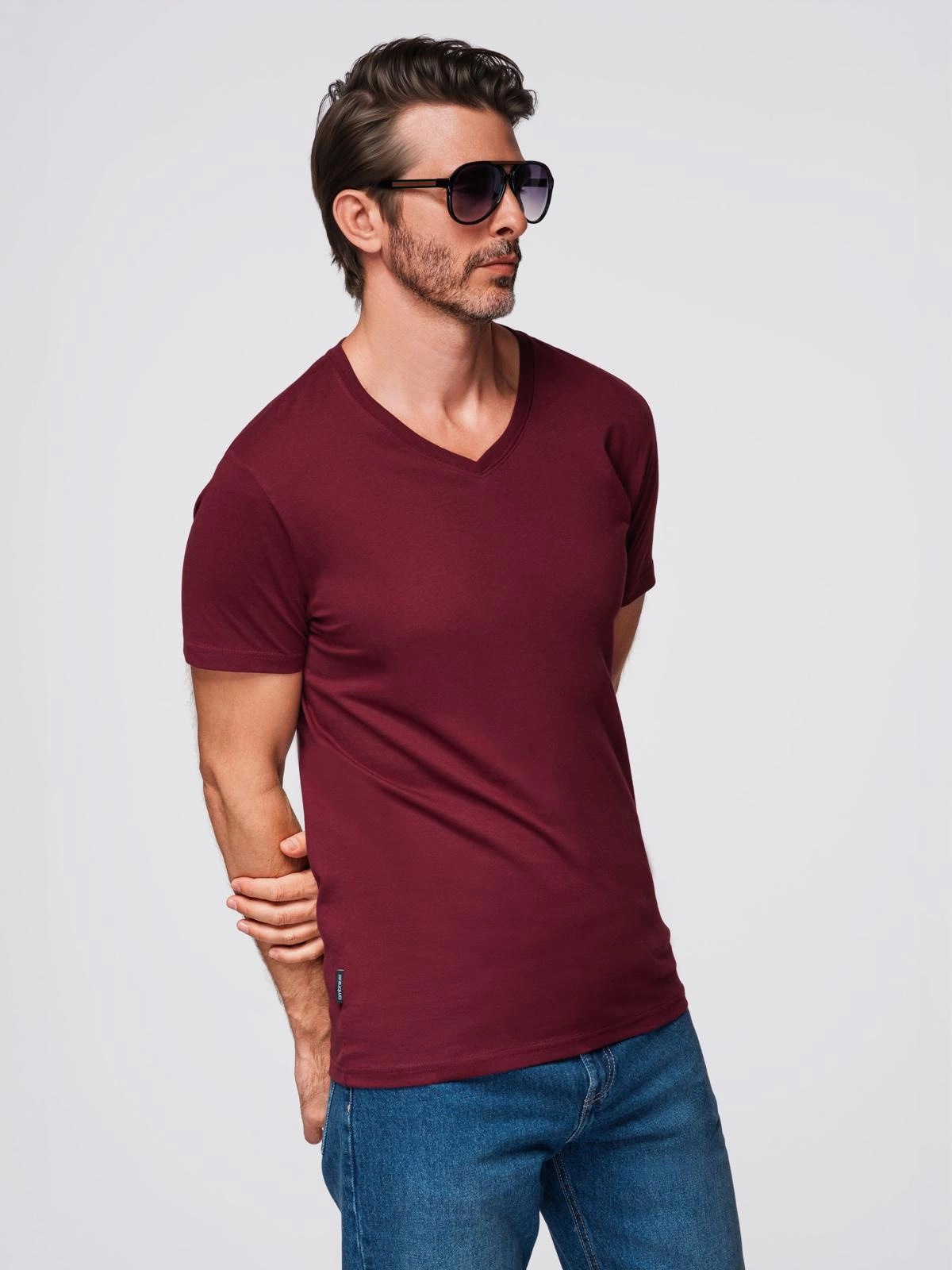 Bavlněné klasické pánské tričko BASIC s výstřihem do V - bordó V10 OM-TSBS-0237