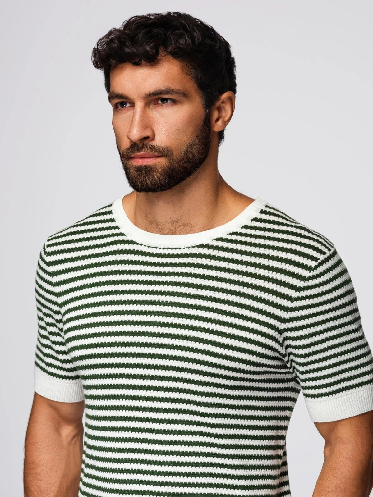 Pánské námořnické pruhované pletené tričko s prolamovanou vazbou - olivová a bílá V3 OM-TSCT-0255