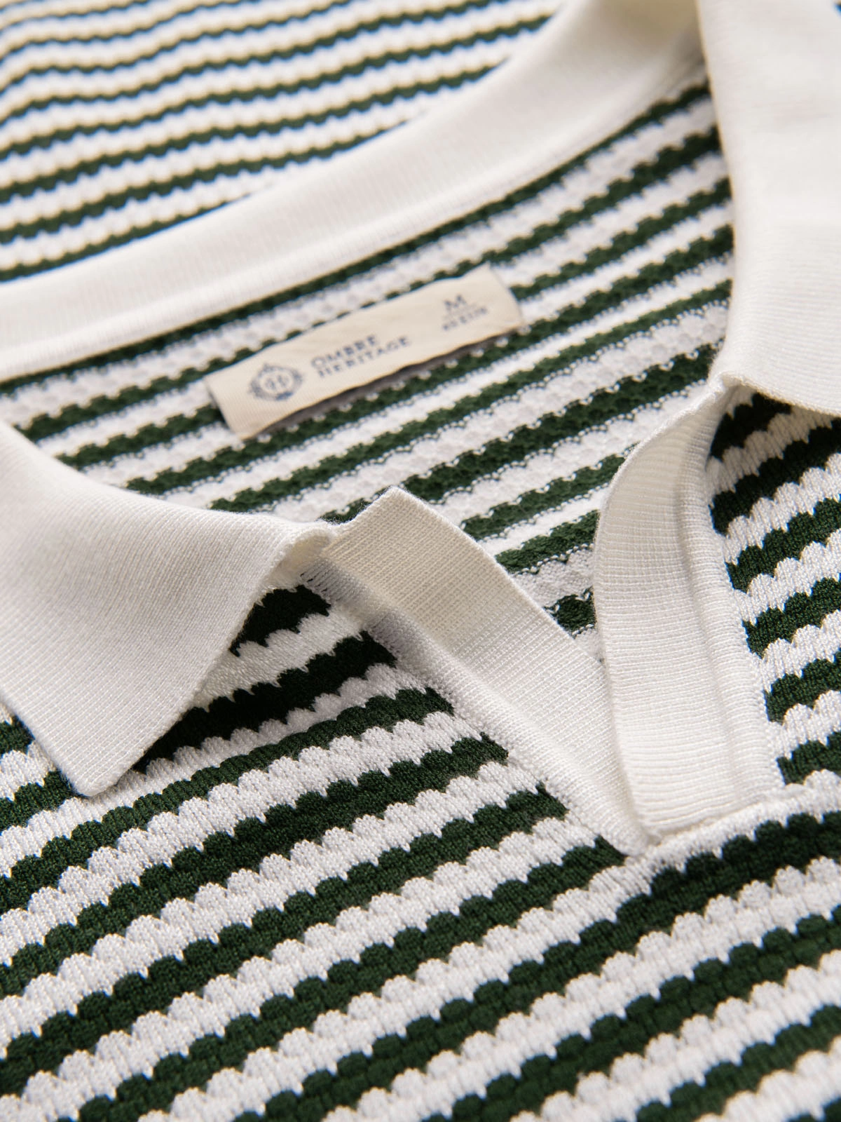 Toto pletené polo tričko je stylové a plné charakteru - kombinuje moderní úzký střih s námořnickým retro nádechem. Výrazné pruhy v kontrastních barvách a otevřený límec podtrhují nenápadnou letní eleganci. Ideální pro muže, kteří ocení pohodlí a nadčasový styl s nádechem svěžesti.