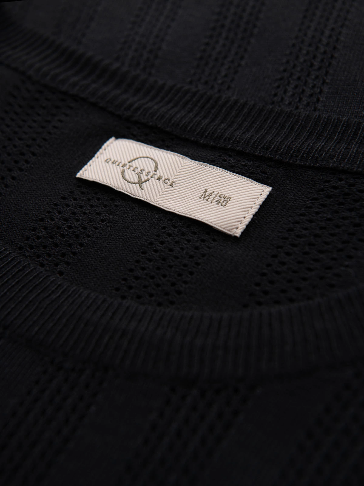 Tričko z kolekce QUINTESSENCE, které díky moderní ažurové vazbě nově definuje klasiku. Lehký a prodyšný design je ideální pro teplejší dny a poskytuje maximální pohodlí a volnost pohybu. Perfektně se hodí pro ležérní stylizaci, ale je dostatečně stylové, aby vyniklo i v rafinovanějších soupravách. Jemný kovový špendlík dodává jedinečný nádech.