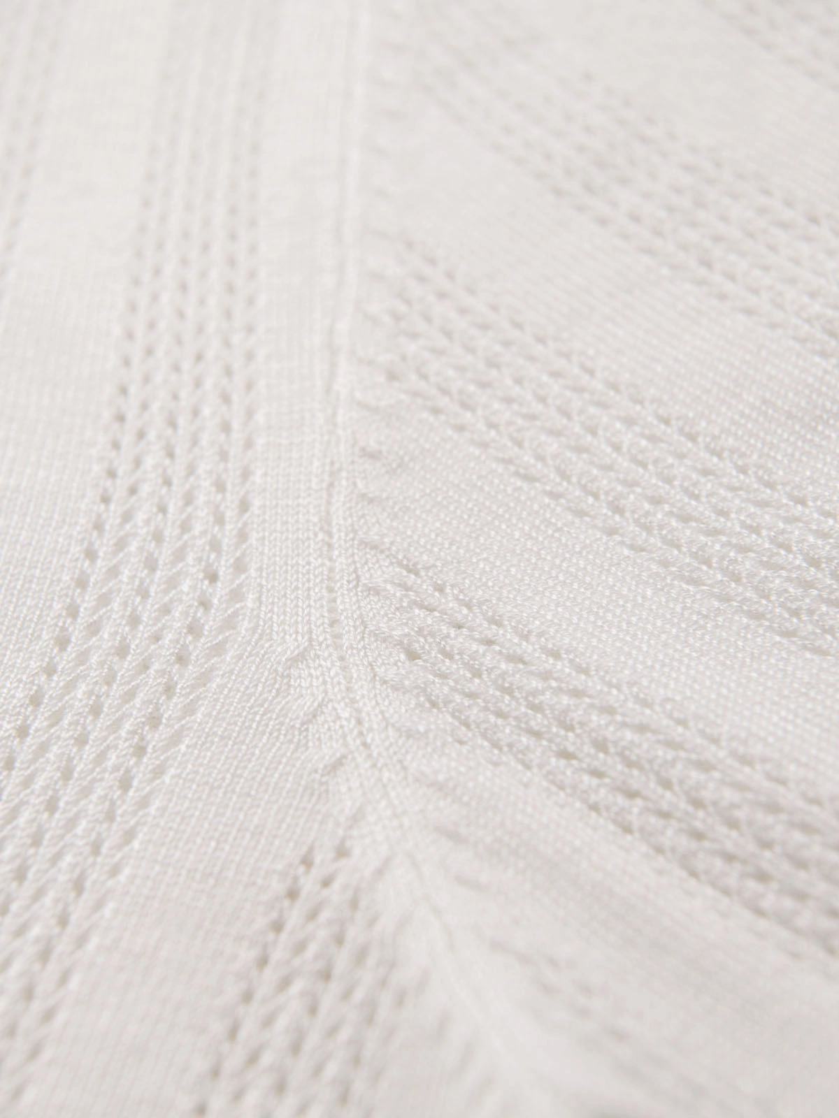 Elegantní a zároveň vzdušná polokošile s prolamovanou vazbou je ideální volbou pro letní dny, kdy je důležitý styl i pohodlí. Minimalistický tvar umocňuje decentní kovové zapínání na zip, které působí moderně. Lehká pletenina měkce sedí na siluetě, zatímco kovové detaily značky podtrhují rafinovaný design.