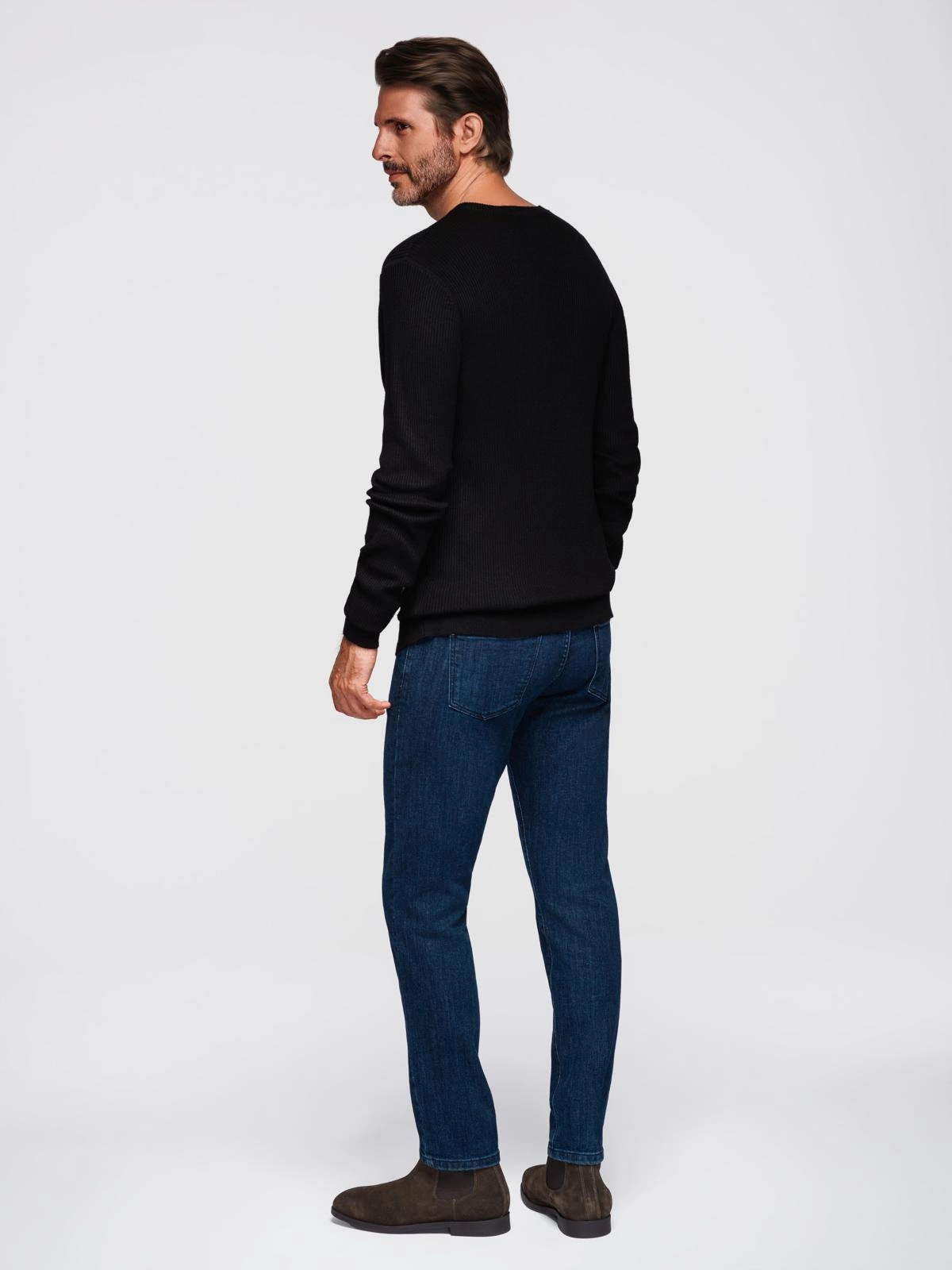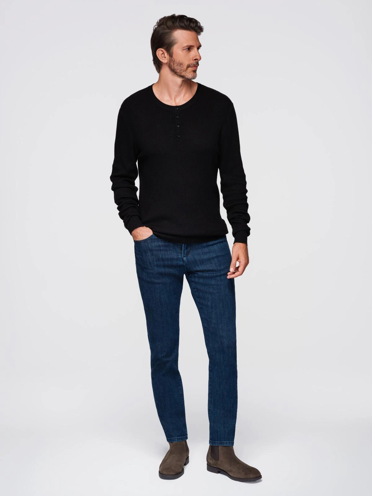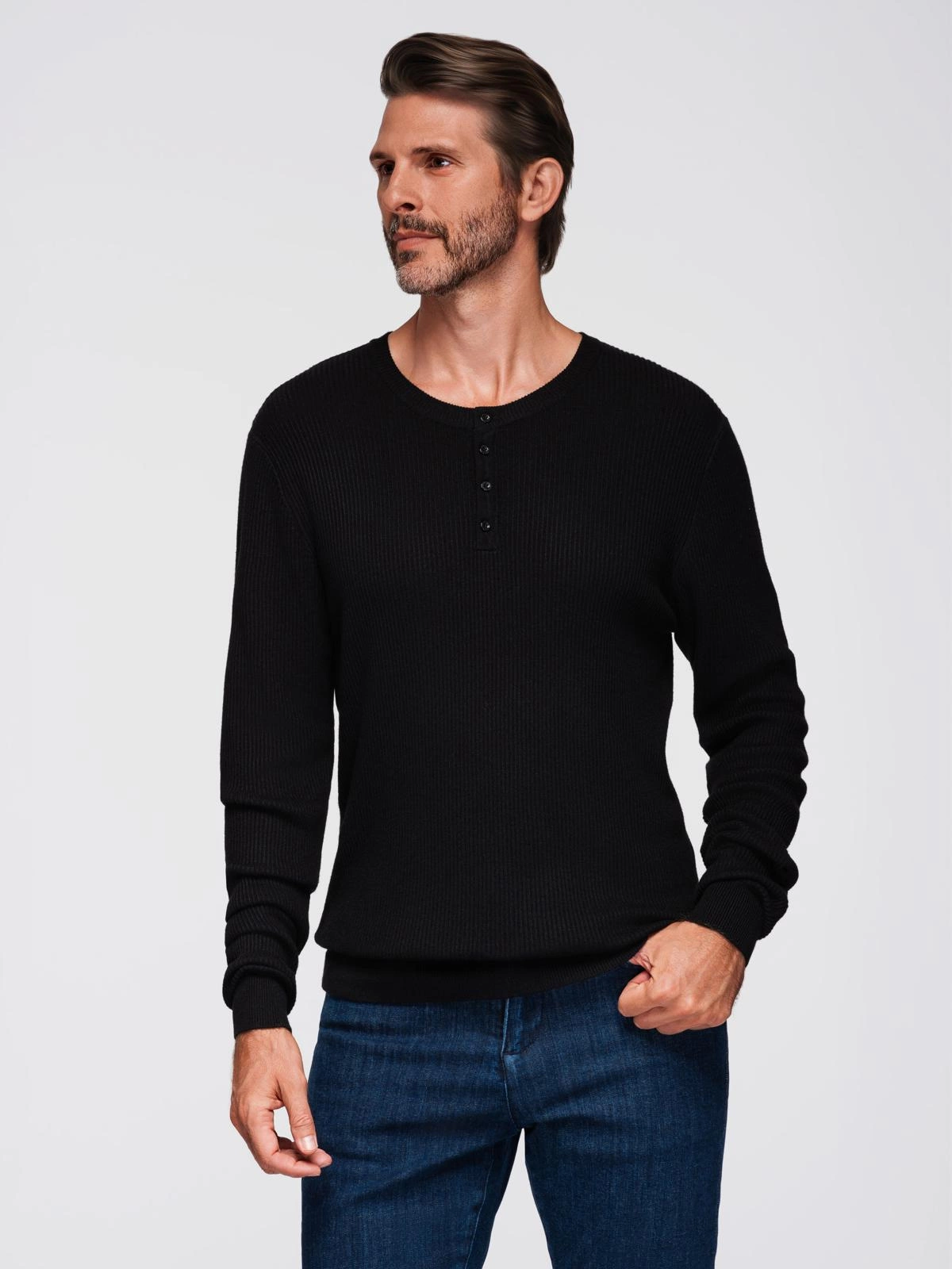 Pánský žebrovaný svetr s knoflíky u výstřihu - černý V2 OM-SWSW-0182
