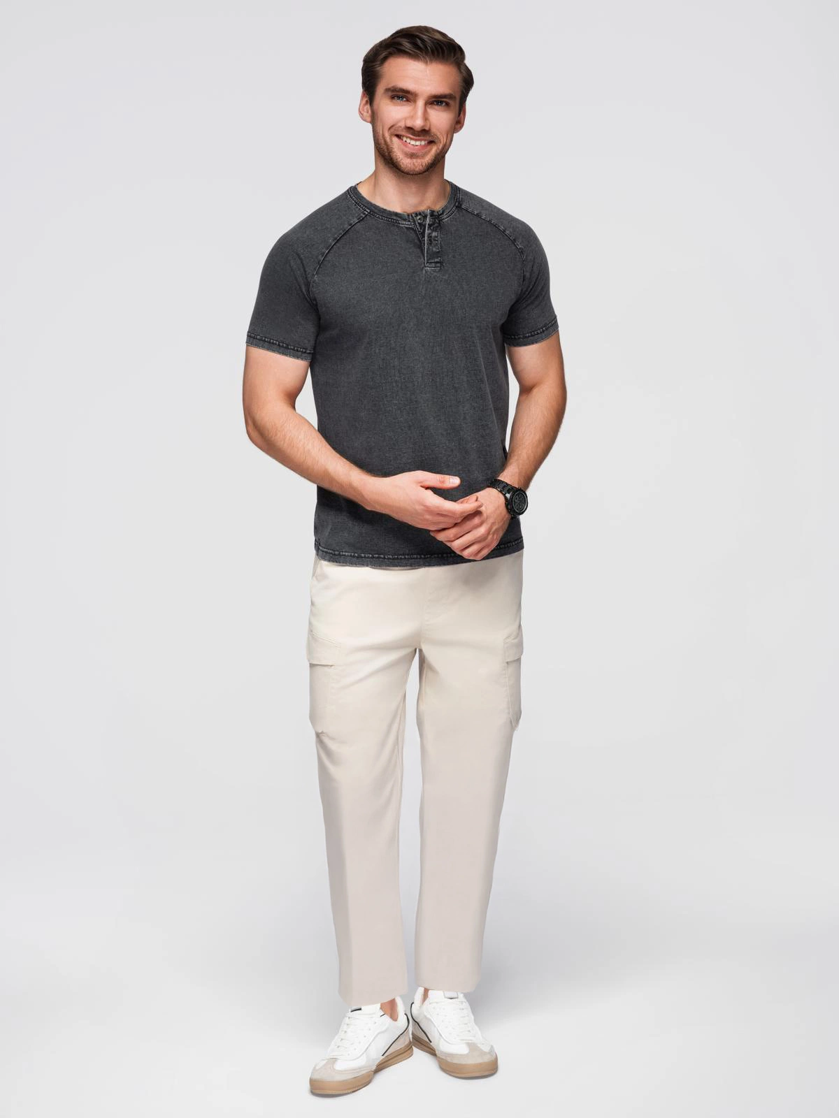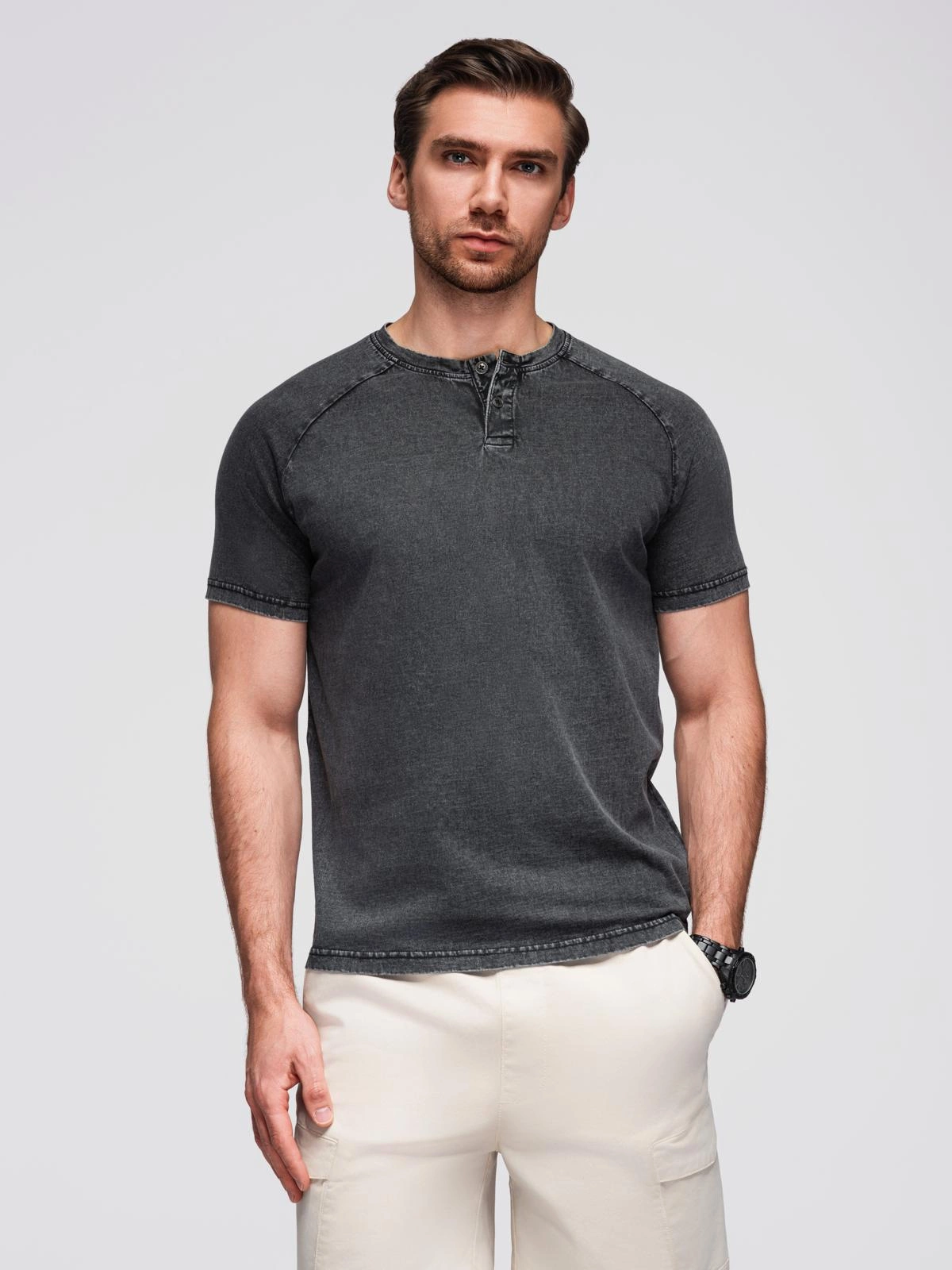 Pánské tričko s pracím efektem a knoflíky u výstřihu - černé V1 OM-TSWT-0150