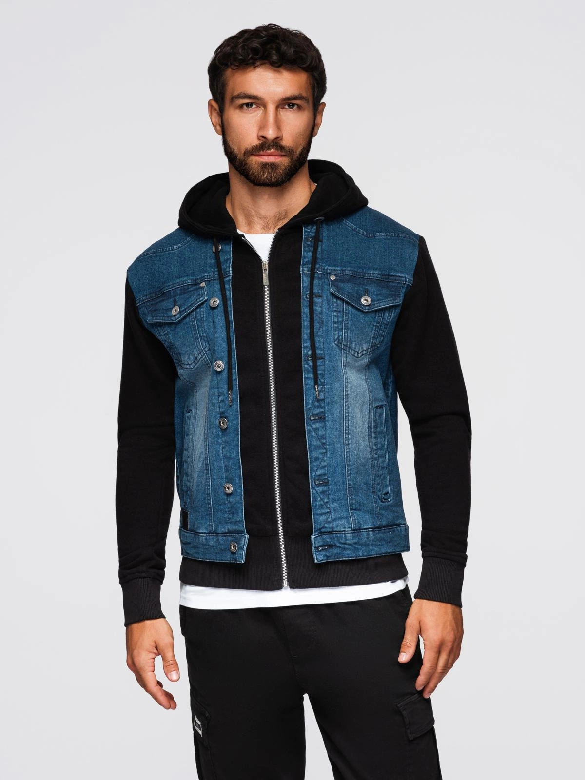 Pánská džínová bunda s pletenými rukávy a kapucí - modrá a černá V2 OM-JADJ-0220