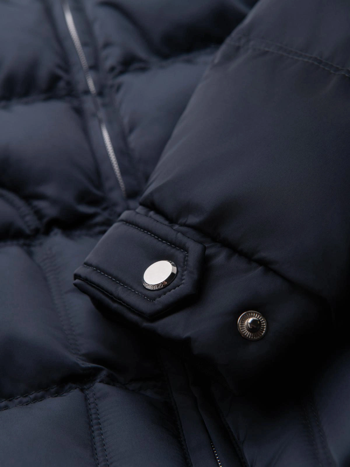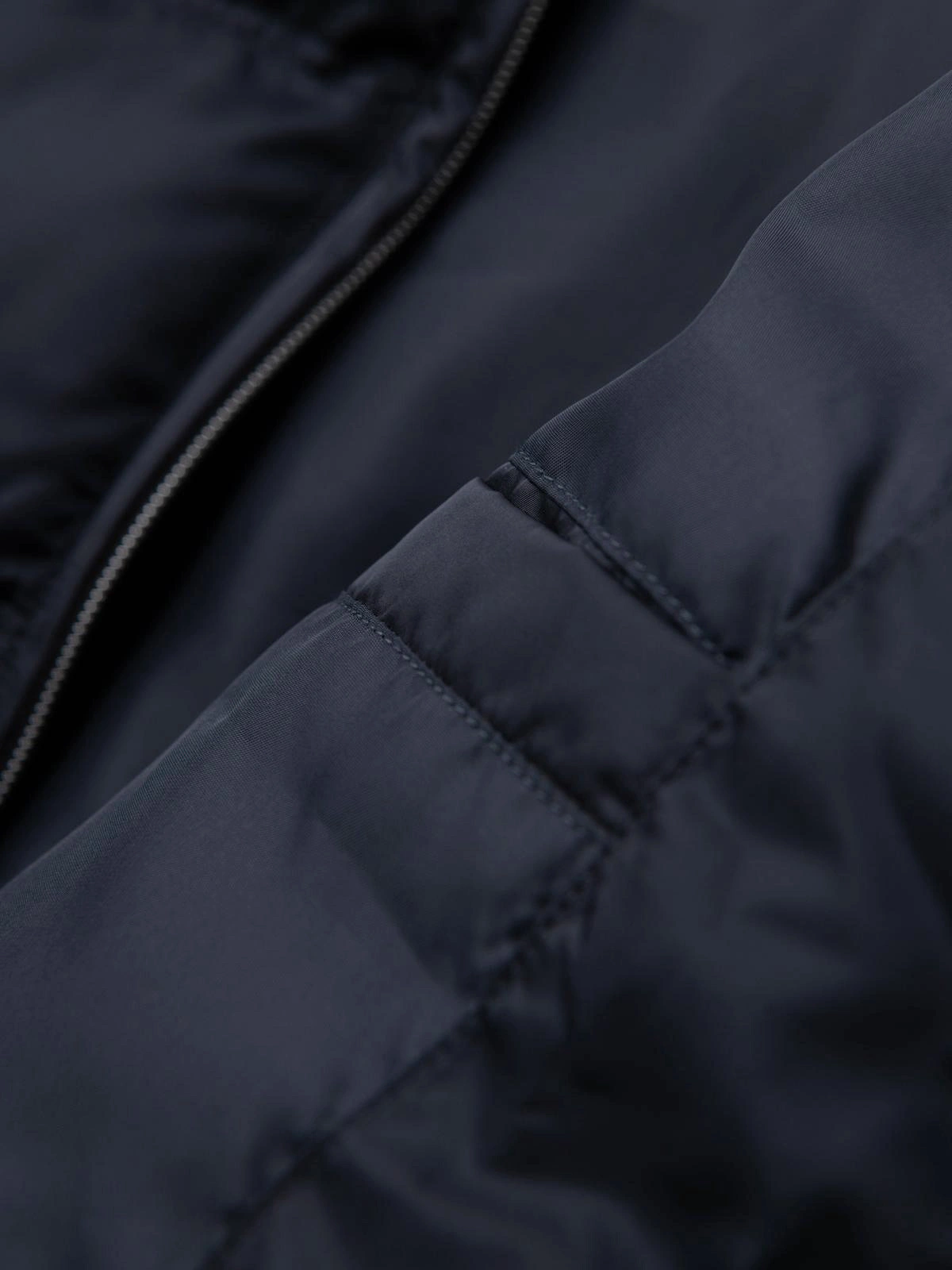 Lehká a zároveň teplá lesklá bunda, která kombinuje eleganci s praktičností. Geometrické prošívání a stojatý límec se zipem jí dodávají moderní nádech, zatímco výrazné doplňky podtrhují mužný styl. Je ideální pro chladnější dny - ať už pro městský nebo ležérní styl - kombinuje pohodlí, ochranu a styl.