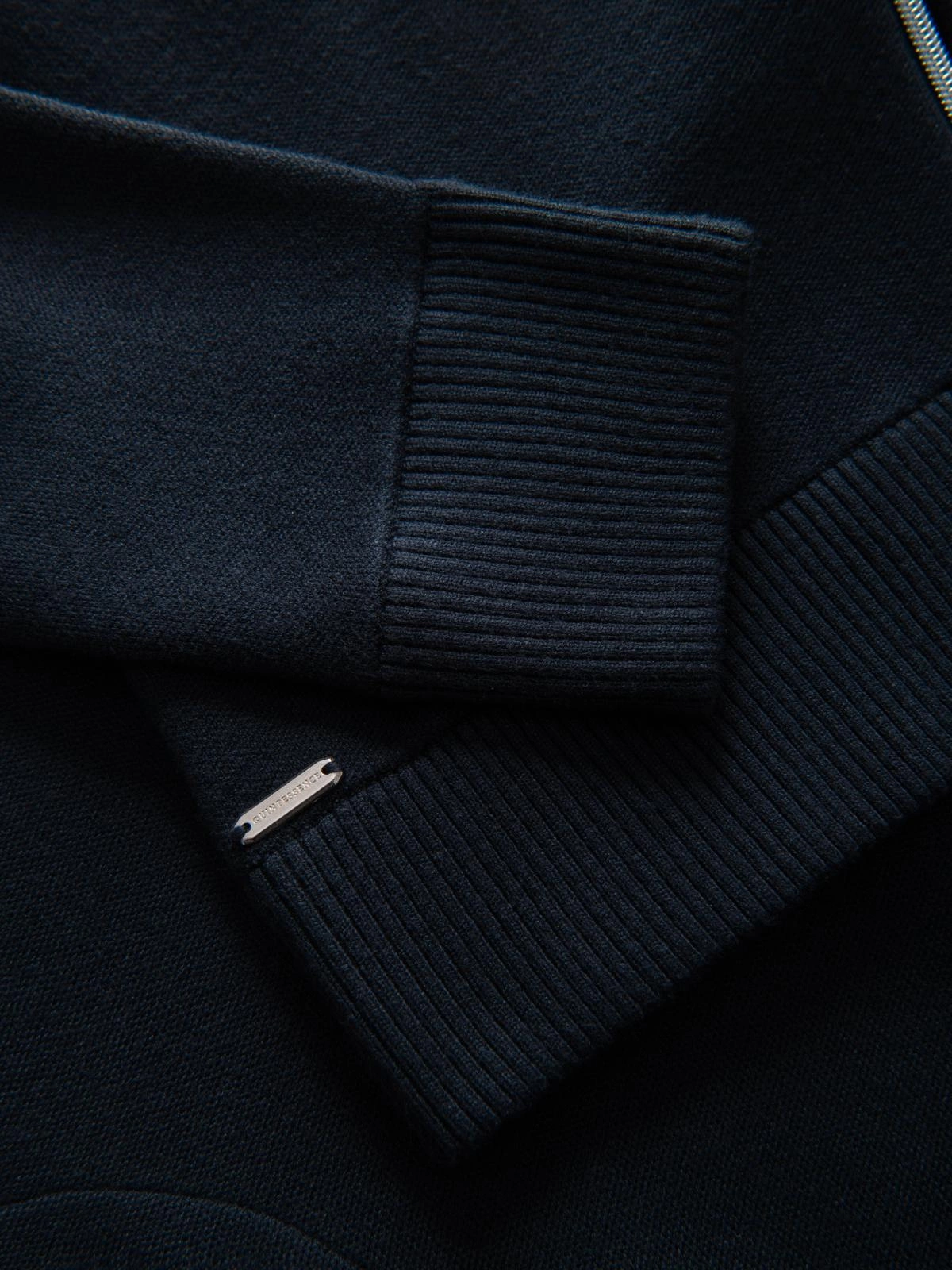 Objevte jedinečný pánský svetr na zip z kolekce QUINTESSENCE - ideální volbu pro muže, kteří ocení pohodlí, kvalitu a moderní styl. Svetr je vyroben z úpletu s hladkou žerzejovou vazbou a poskytuje příjemný střih a pohodlné celodenní nošení. Model připomínající střih bundy typu bomber je vybaven středovým kovovým zipem, který mu dodává moderní nádech a funkčnost. Je zakončen žebrovanými lemy a ve spodní části svetru ho zdobí decentní kovový cvoček s logem značky. Je skvělým základem pro každodenní i poloformální stylizaci - hodí se k džínám i chinos kalhotám.