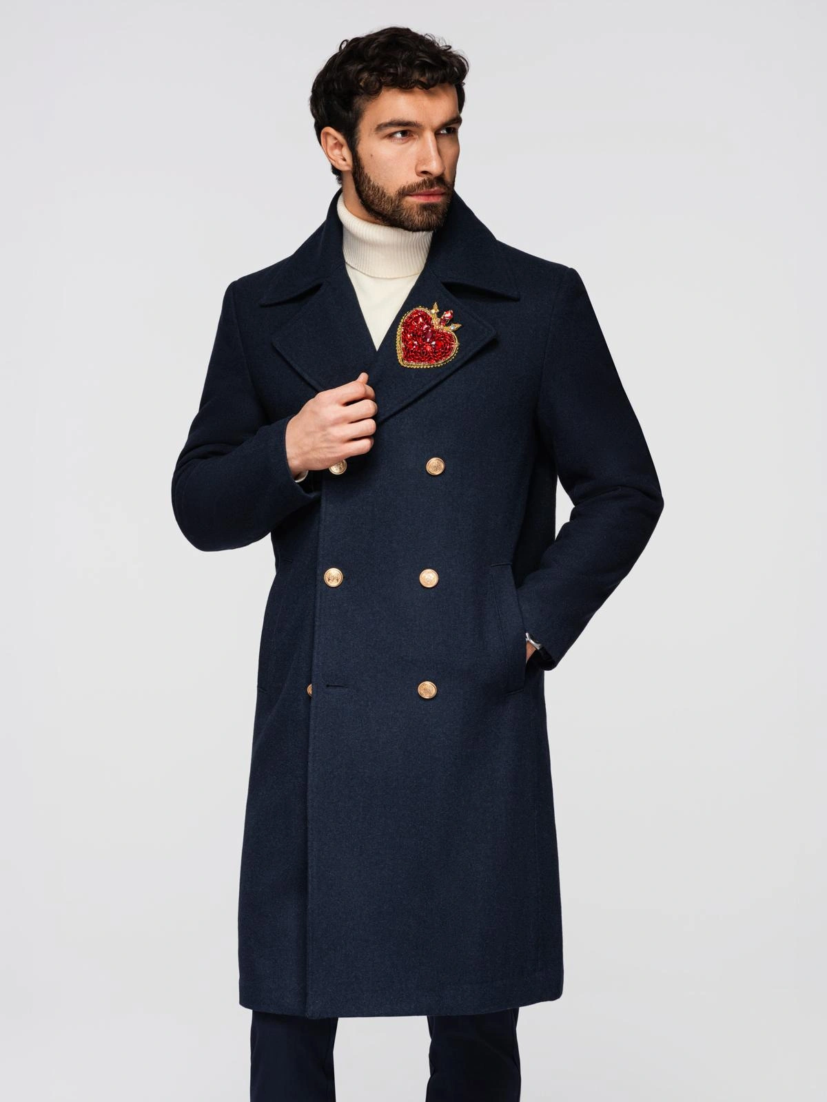 Pánský dvouřadový kabát s vlnou a ozdobnými aplikacemi - V1 námořnická modř OM-COWC-0149