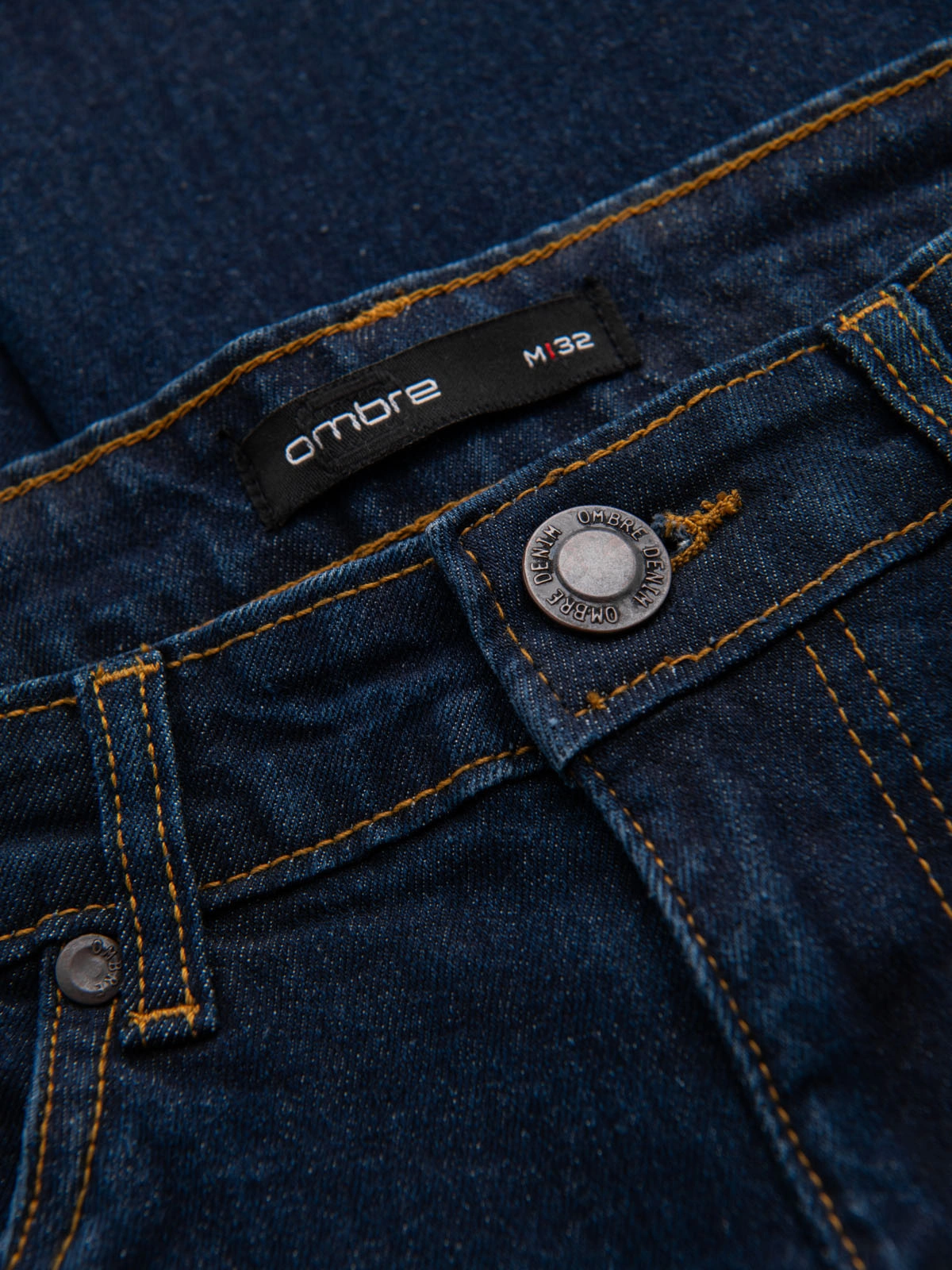 Pánské džíny z řady Ombre Denim ve střihu regular fit, vyrobené z mírně elastické tkané džínoviny. Tkanina s příměsí elastanu zajišťuje přiléhavý střih a udržuje tvar. Povrchová úprava obsahuje oděr charakteristický pro džíny. Model je vybaven dvěma předními a dvěma zadními nakládanými kapsami; bavlněné kapsové tašky zvyšují pohodlí. Použity jsou kovové knoflíky a nýty, nášivka z umělé kůže a malý tkaný štítek na jedné ze zadních kapes.