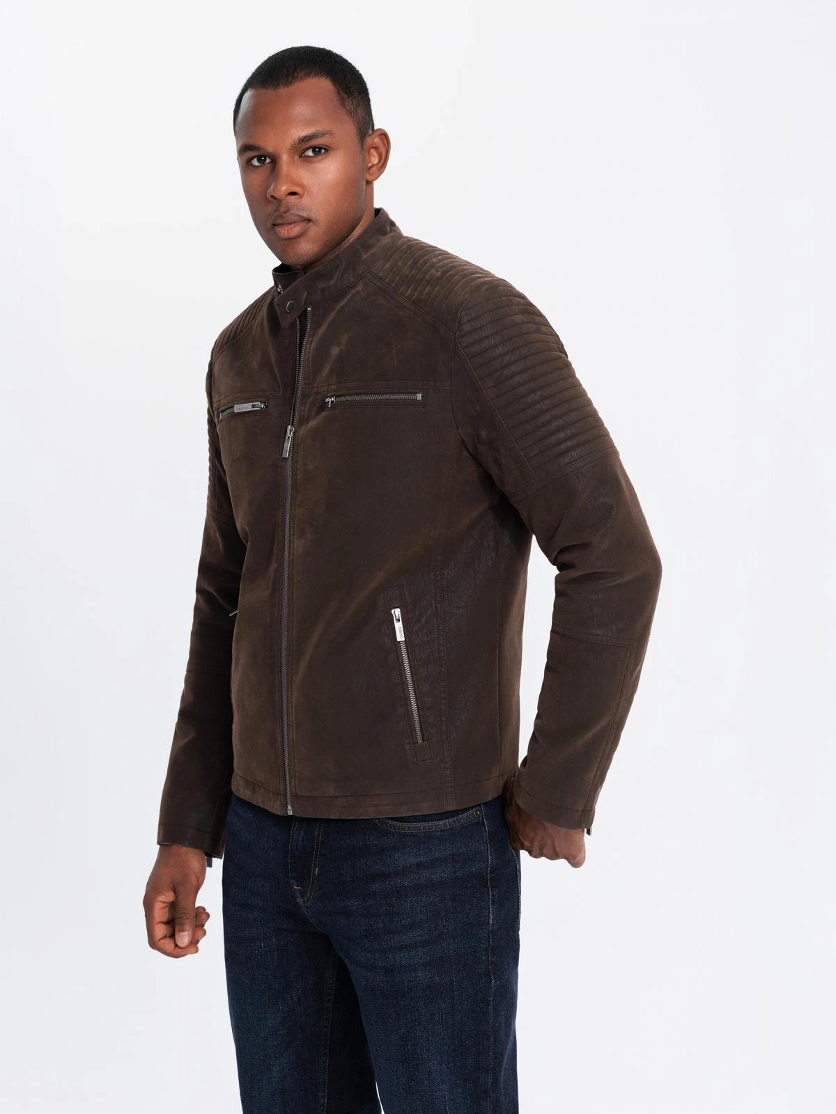Men's retro biker jacket with stand-up collar - brown V1 OM-JAFL-0197