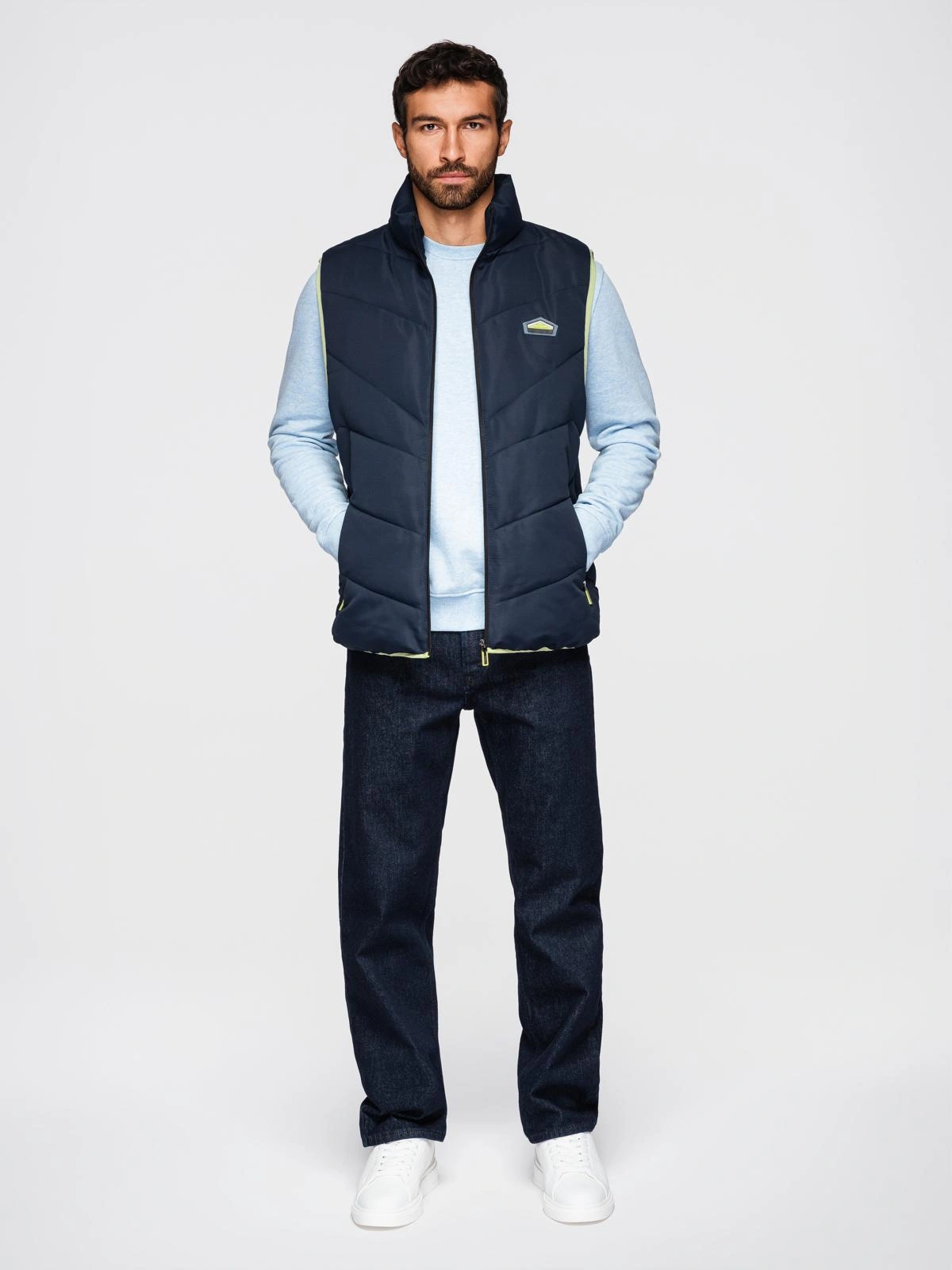 Men's quilted sleeveless jacket with neon accents - navy blue V3 OM-JAVJ-0210