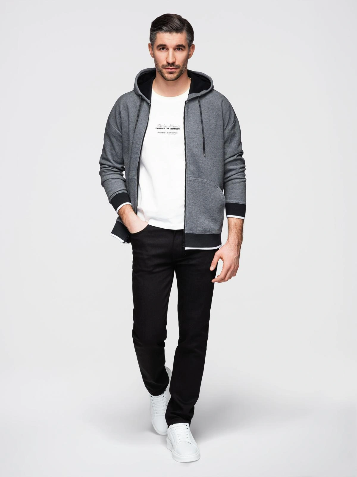 Obligatory in every man's closet. Basic products, are practical base clothes, with the help of which you can easily compose your daily styling. In our basic collection you will find sweatshirts, sweaters, sweatpants, t-shirts and longsleeves. They are designed with harmony and functionality in mind. All proposals have a smooth, simple form and a variety of colors, so that everyone can find a set that is perfect for them. Clothes from the Basic line can form stand-alone styles, as well as the basis for those more complex sets. They guarantee comfort of wear and a neat and elegant appearance.