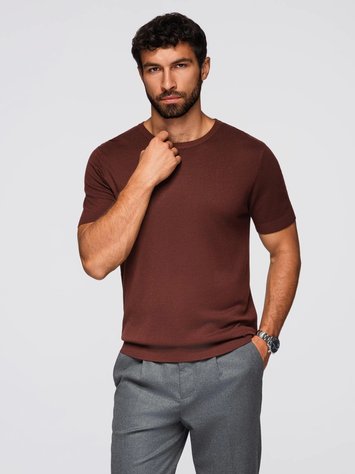 Men's classic knitted shirt with ribbed cuffs - warm brown V4 OM-TSCT-0252