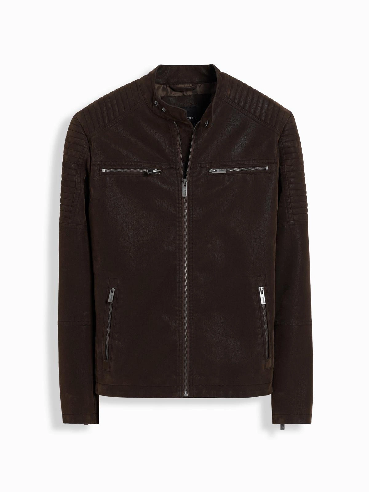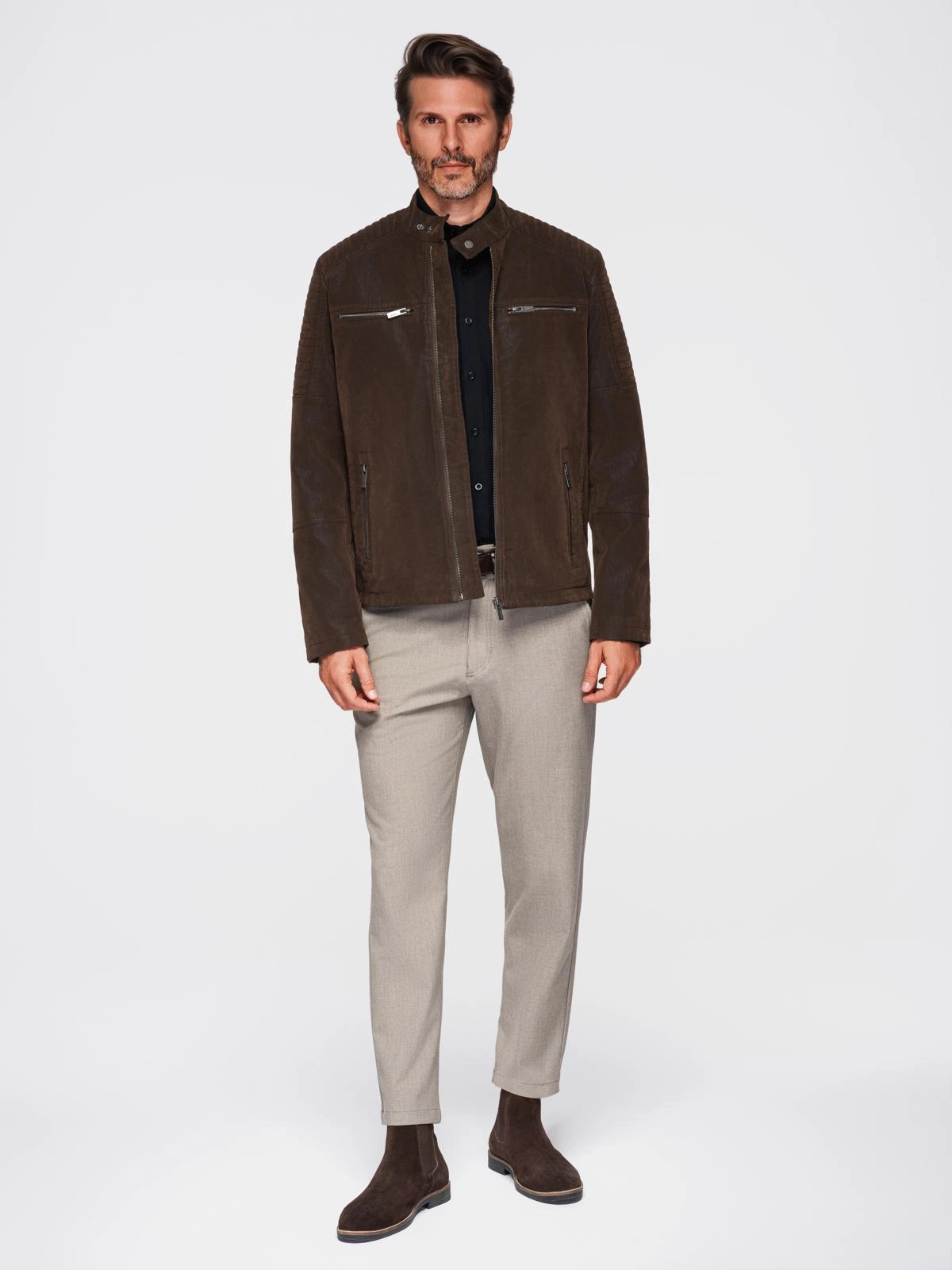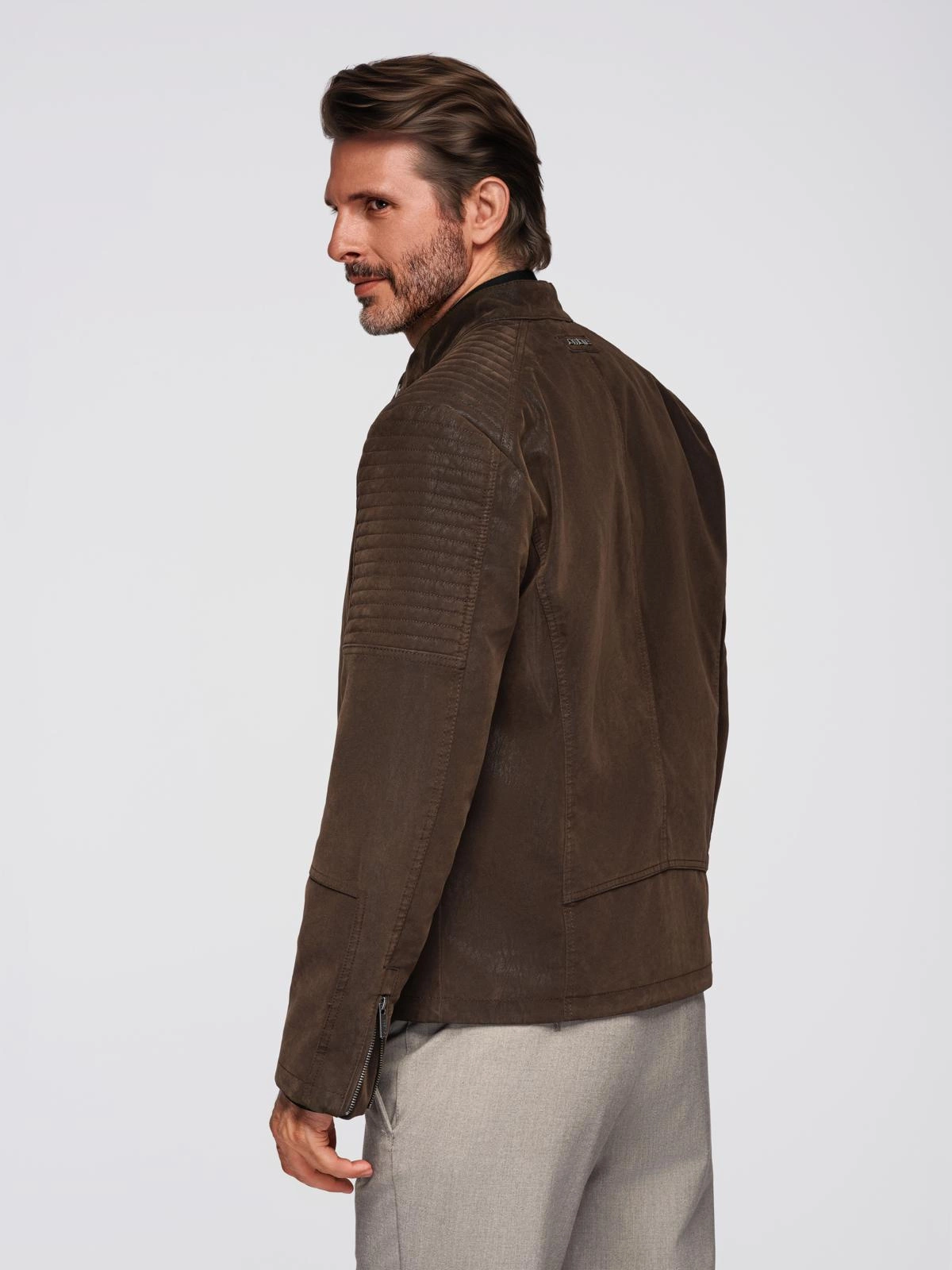 Men's stylish eco leather biker jacket with collar - dark brown V1 C637