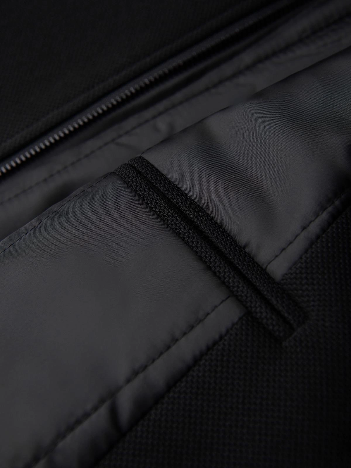 - three front zippered pockets - pleated covered chest pocket and two pockets with visible zippers