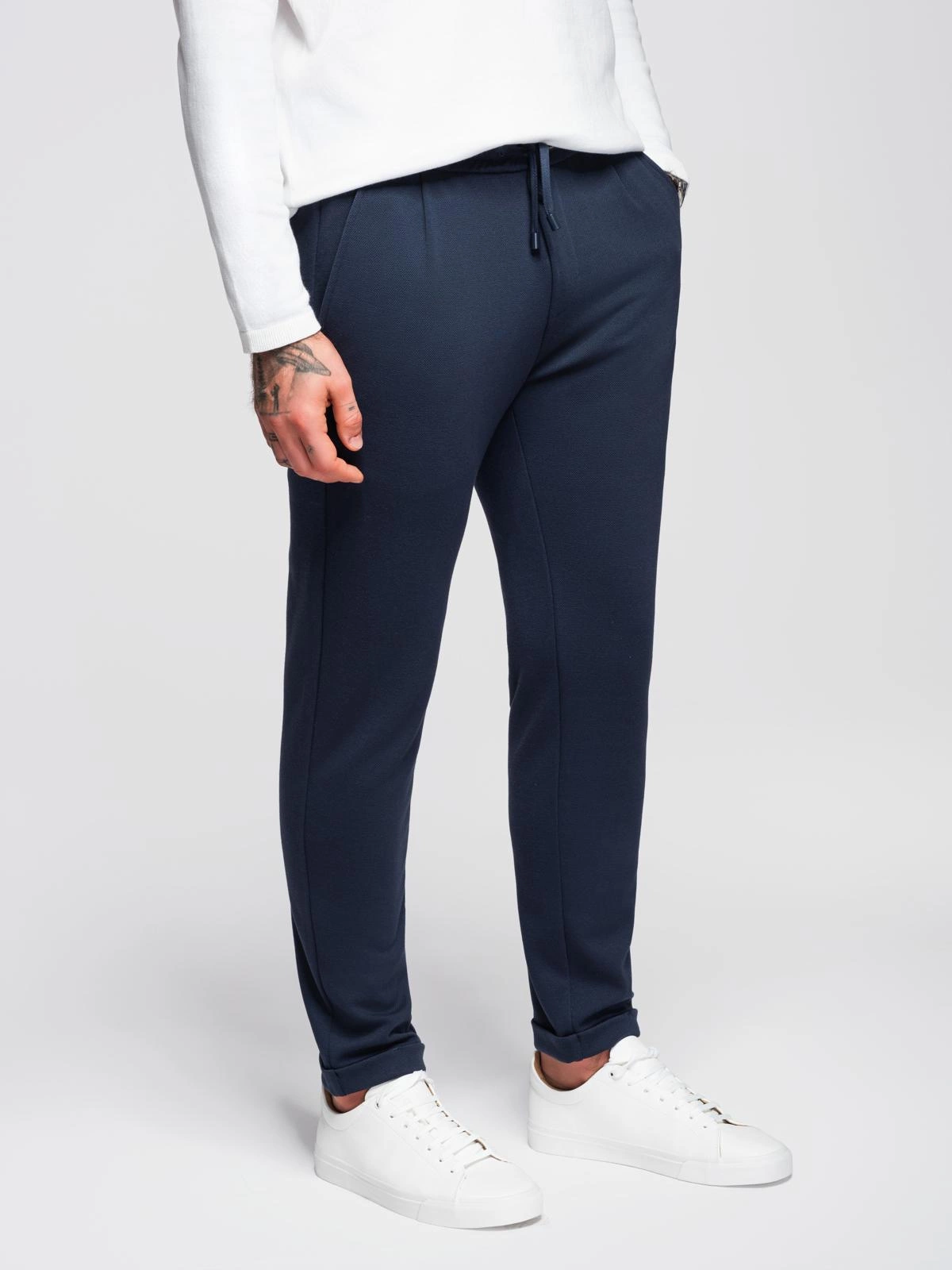 Men's pique knit pants with adjustable waistband - navy blue V1 OM-PACP-0283