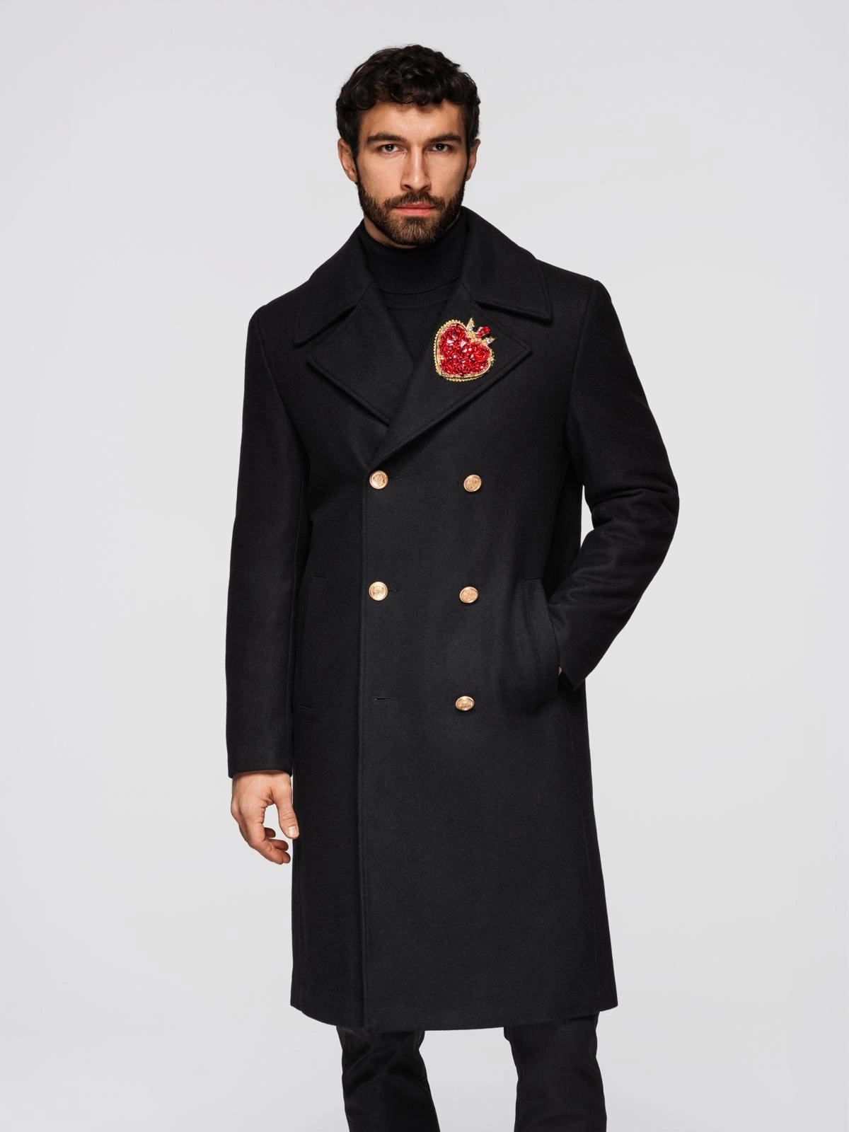 Men's double-breasted wool coat with decorative appliqués - black V1 OM-COWC-0147