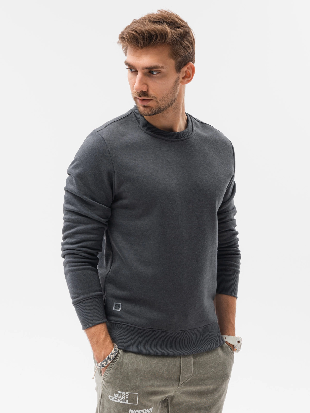 Men's classic sweatshirt from basic collection. Put on over the head. Made of pleasant and soft material. Perfectly adapts to the figure. Round neckline. Bottom and sleeves of sweatshirt finished with welt. Comfortable cut makes the sweatshirt perfect for everyday wear.