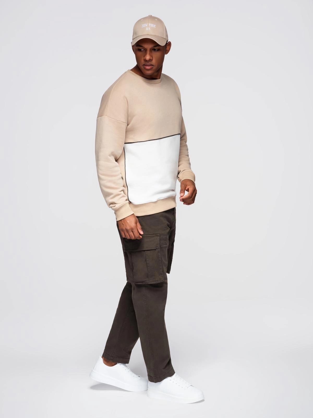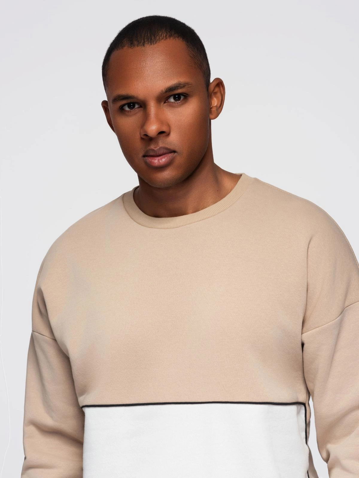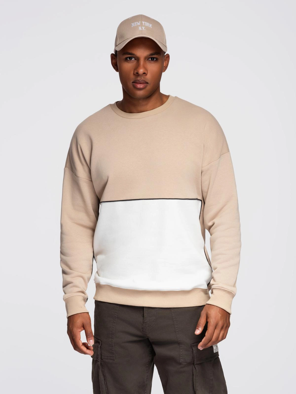 Vyriški kontrastingų spalvų marškinėliai OVERSIZE - smėlio spalvos V2 OM-SSNZ-0130
