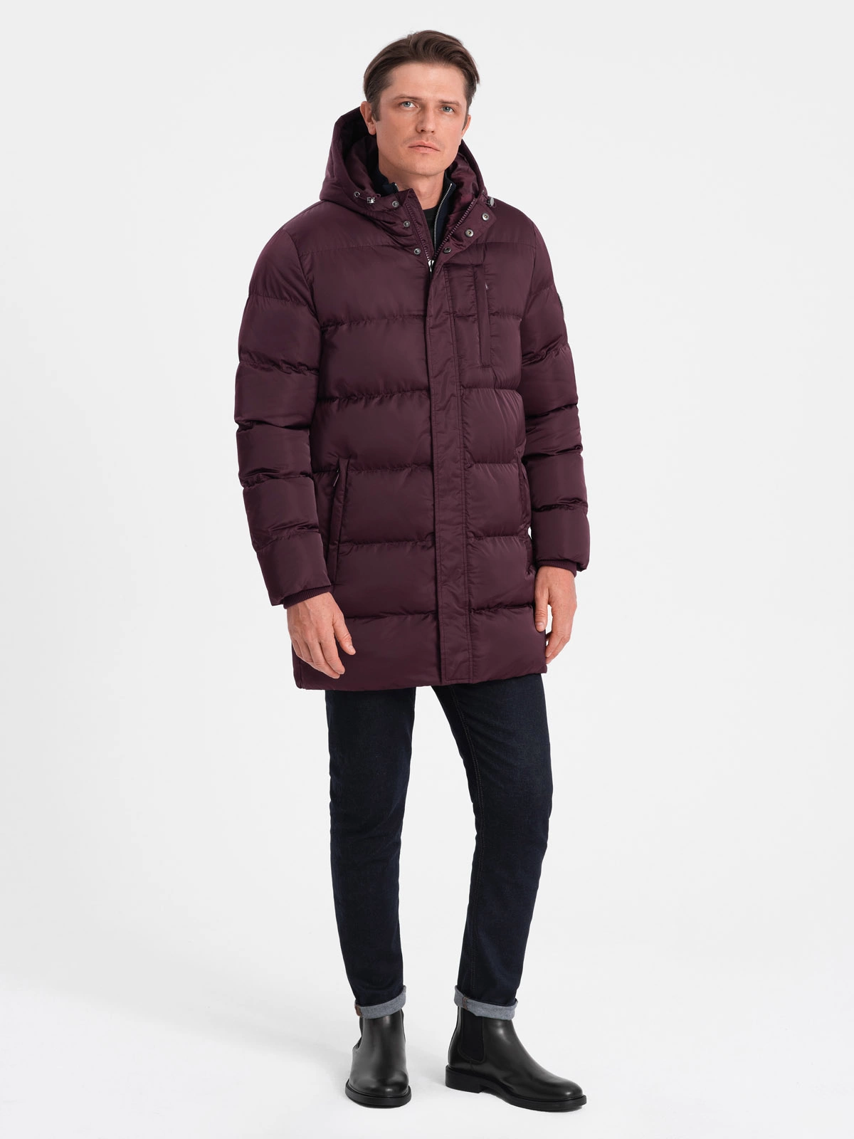 Vyriška ilga žieminė dygsniuota striukė su satino apdaila - bordo spalvos V4 OM-JALJ-0147