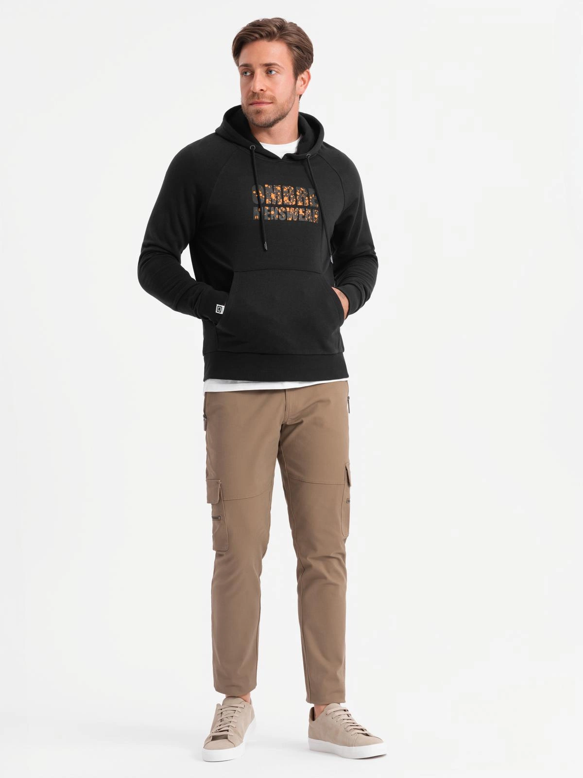Vyriškas kengūros tipo džemperis su gobtuvu ir spauda - juodas V2 OM-SSPS-0155