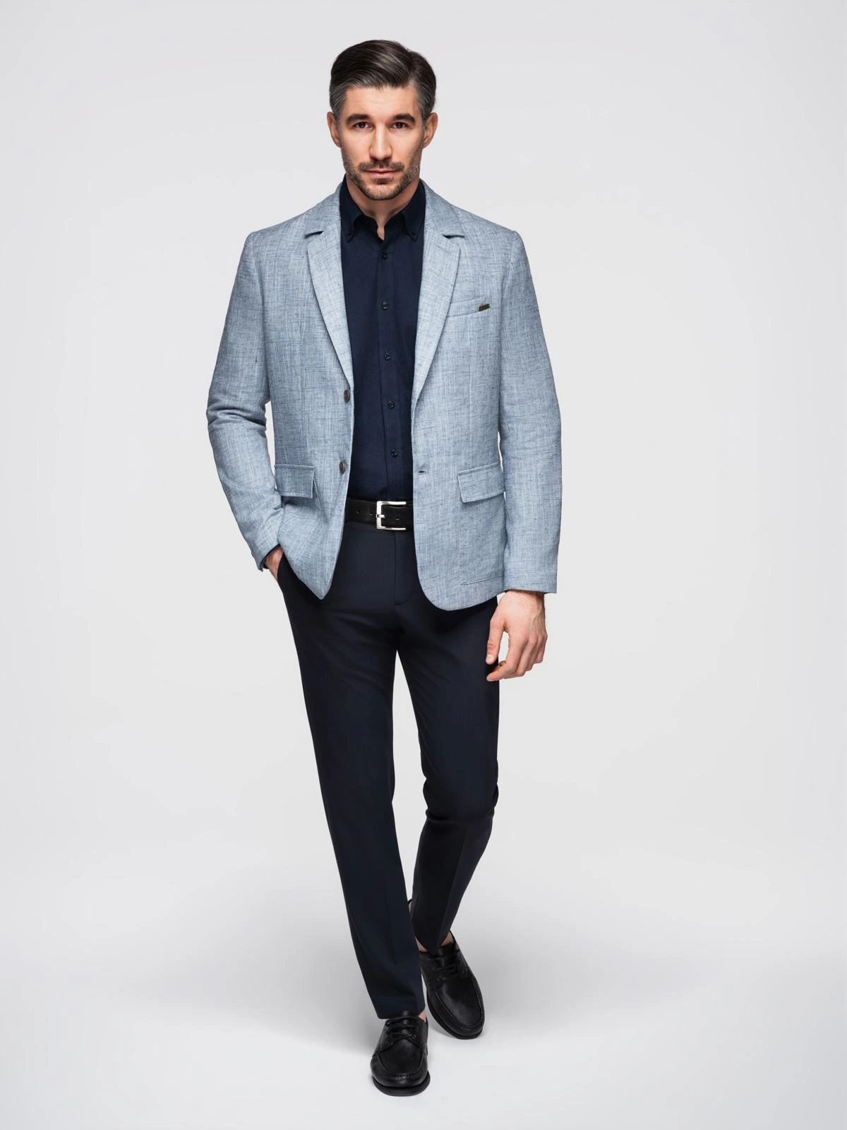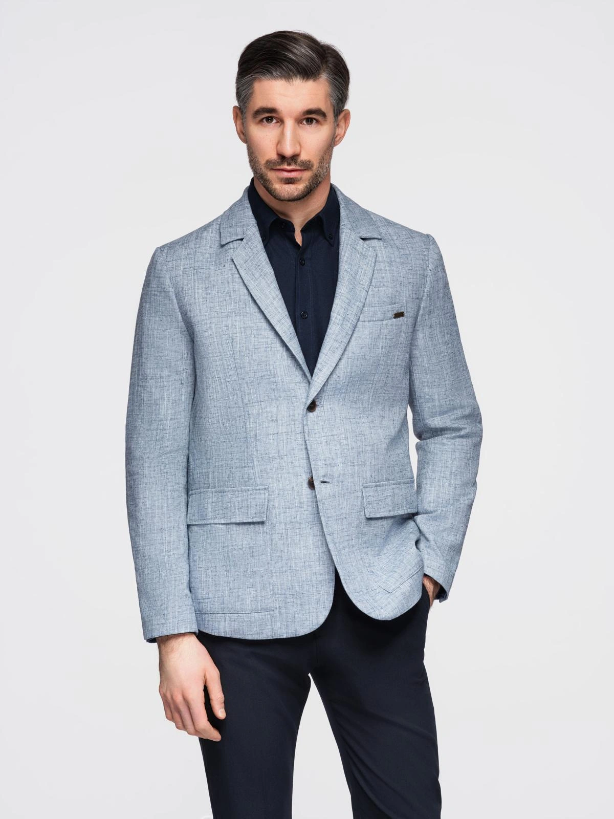 Vyriškas reguliaraus kirpimo švarkas su linu - šviesiai mėlynas V3 OM-BLZB-0128