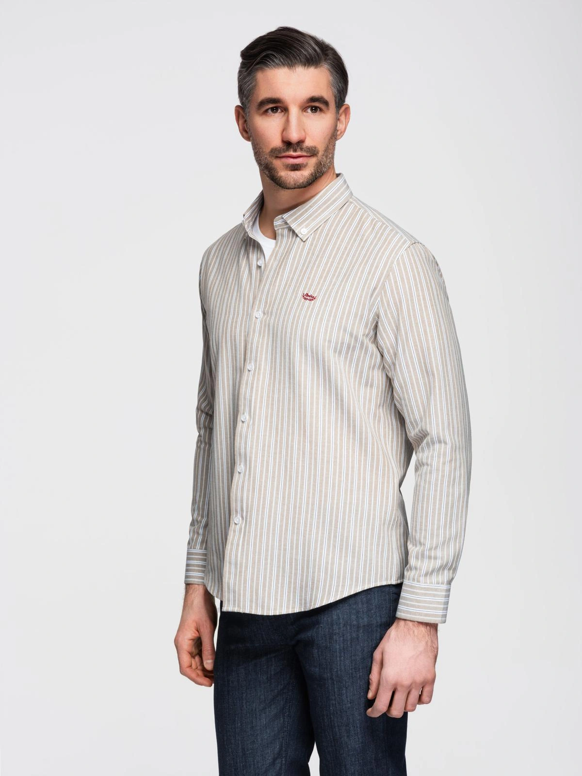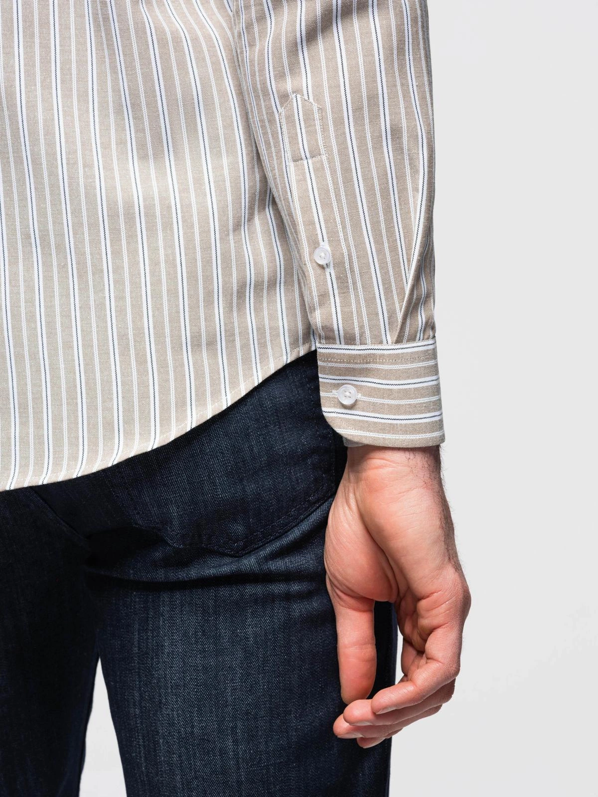 Vyriški medvilniniai REGULAR FIT marškiniai su smulkiomis juostelėmis - smėlio spalvos V1 OM-SHOS-0170
