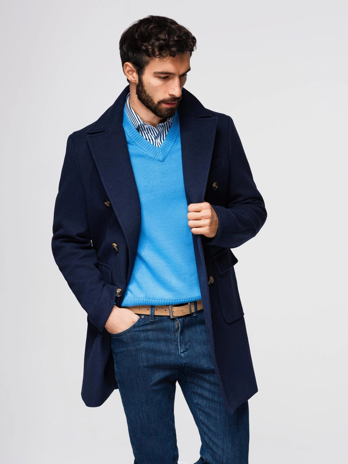 Vyriškas paltas su dekoratyvinėmis sagomis - indigo V1 OM-COWC-0109