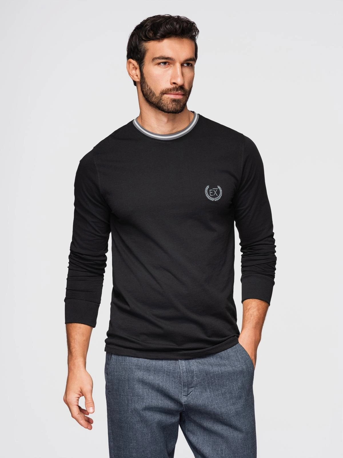 Vyriški medvilniniai marškinėliai ilgomis rankovėmis su dryžuota U formos iškirpte ir siuvinėjimu - juodi V4 OM-LSCL-0128