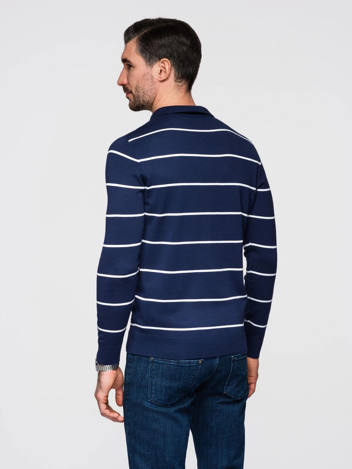 Vyriškas polo su horizontaliais dryžiais ir ilgomis rankovėmis iš viskozės - tamsiai mėlyna ir balta V1 OM-POLS-0146
