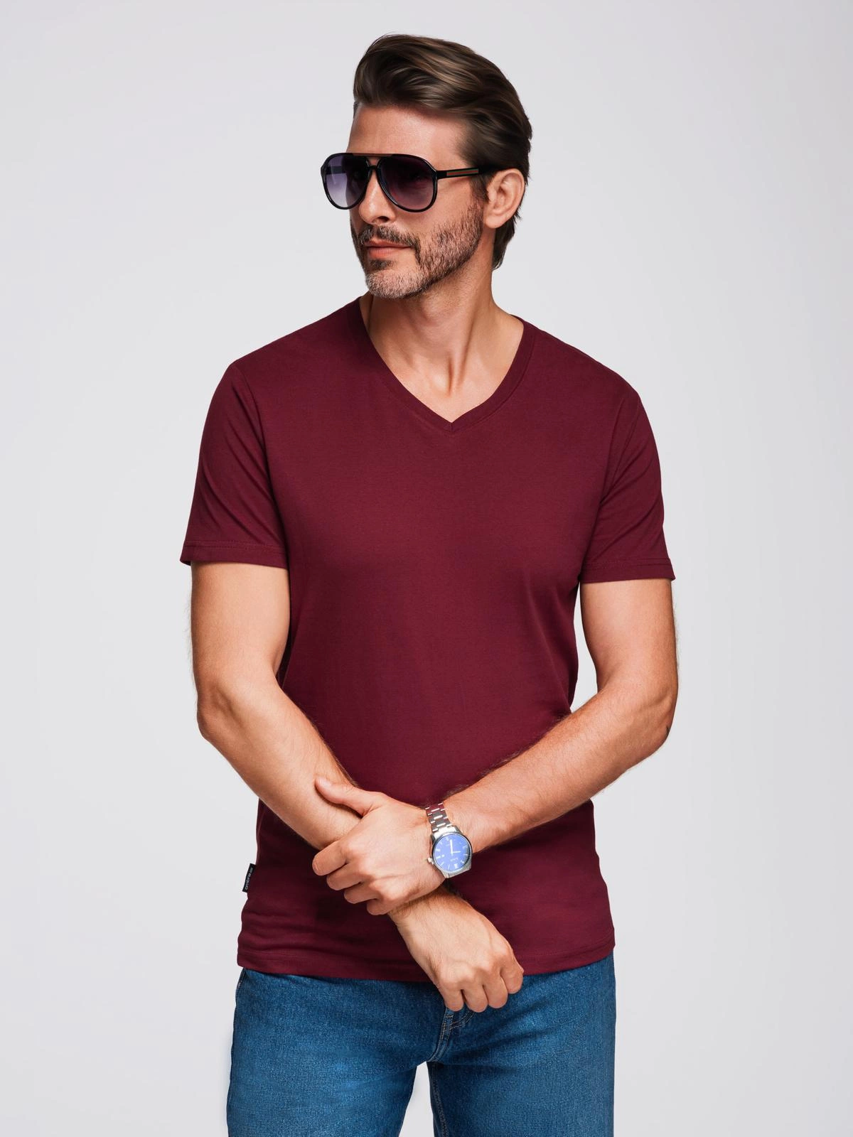 Medvilniniai klasikiniai vyriški marškinėliai BASIC su V formos iškirpte - bordo spalvos V10 OM-TSBS-0237