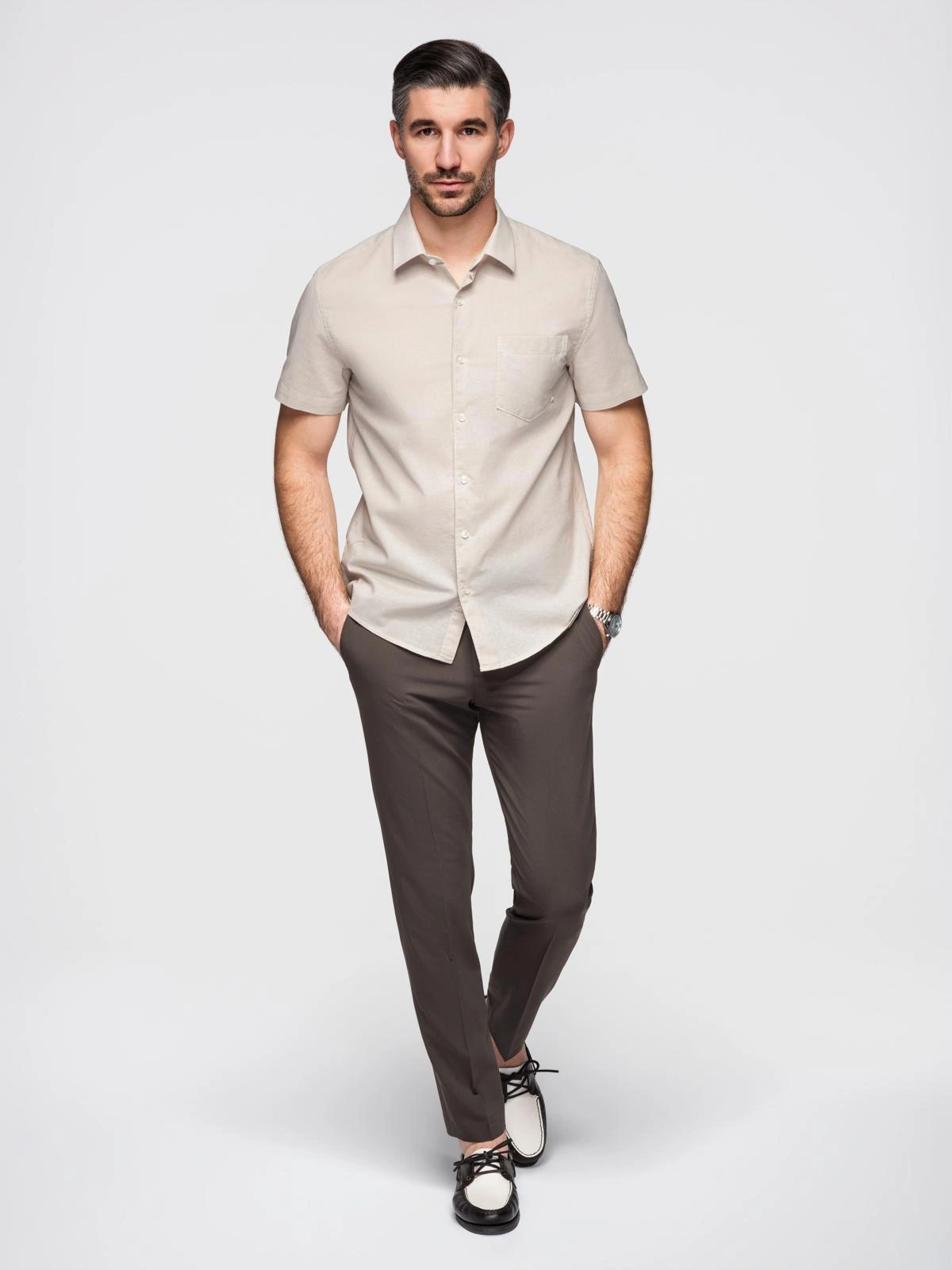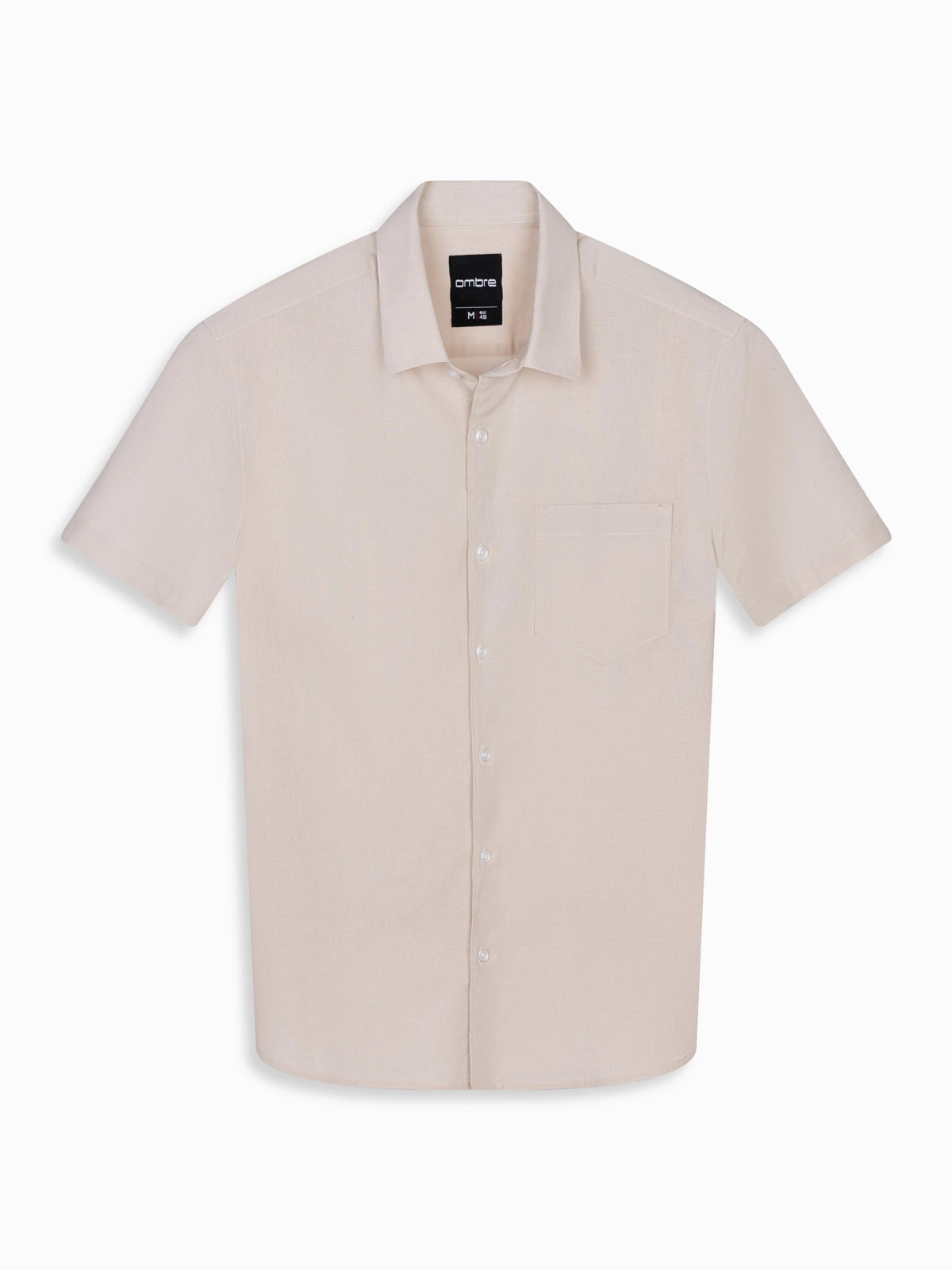 Vyriški lininiai ir medvilniniai marškiniai trumpomis rankovėmis su kišenėmis - smėlio spalvos V4 OM-SHSS-0167