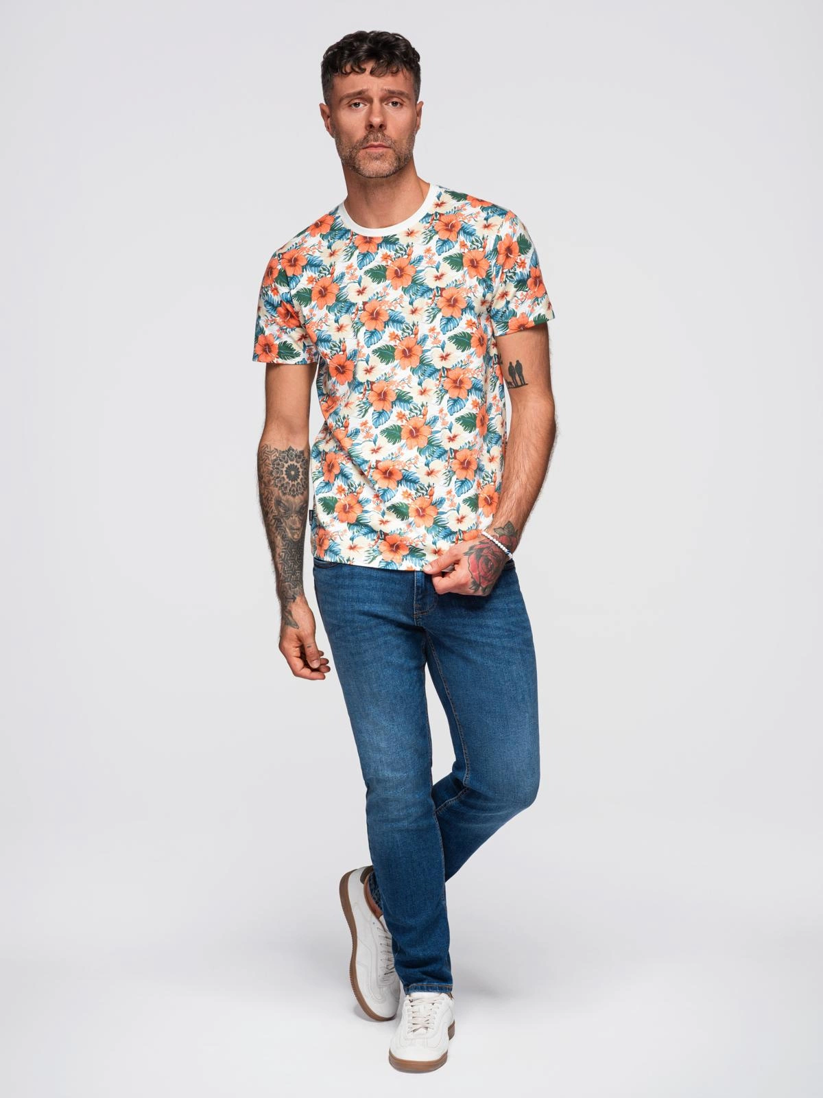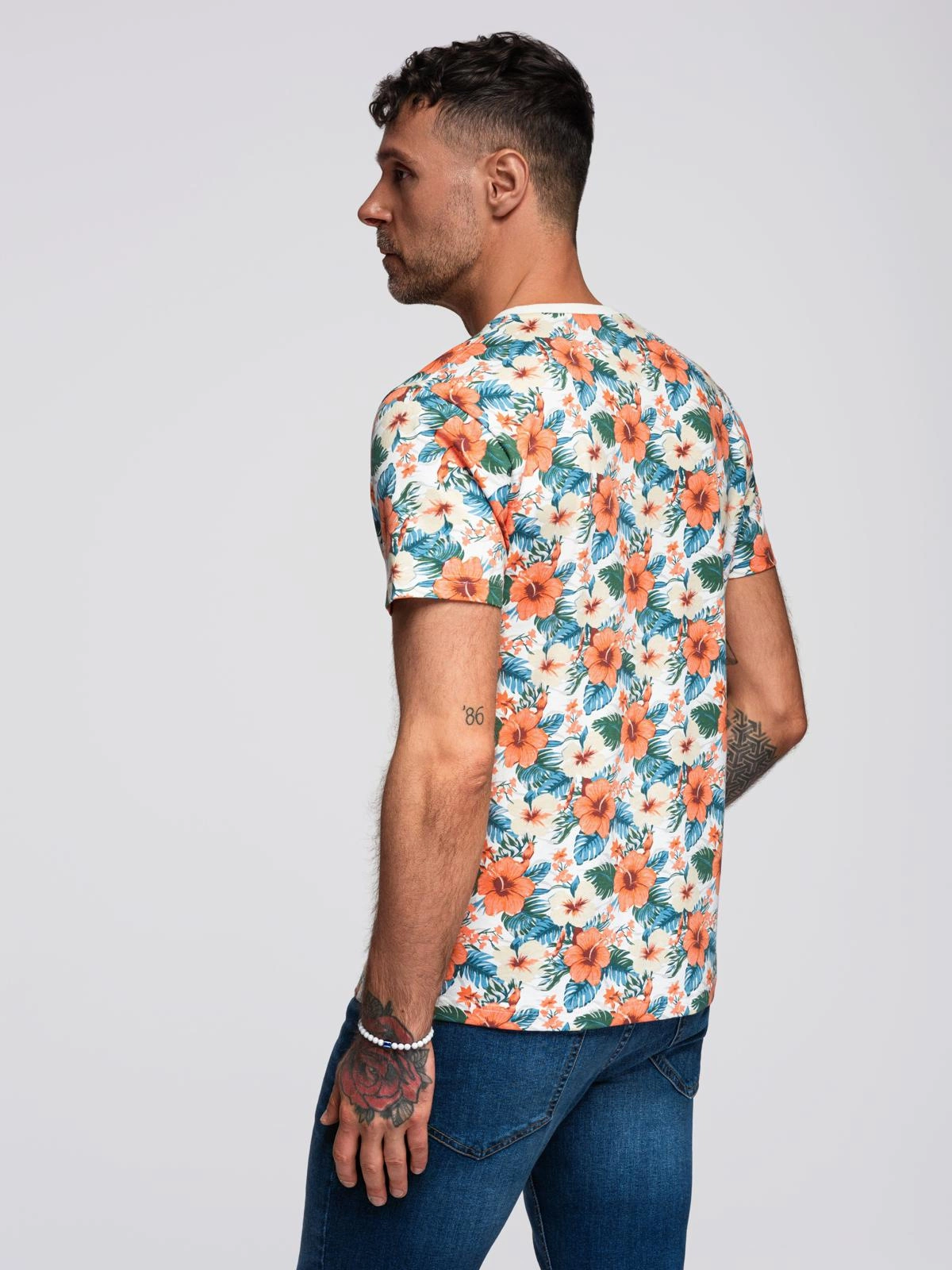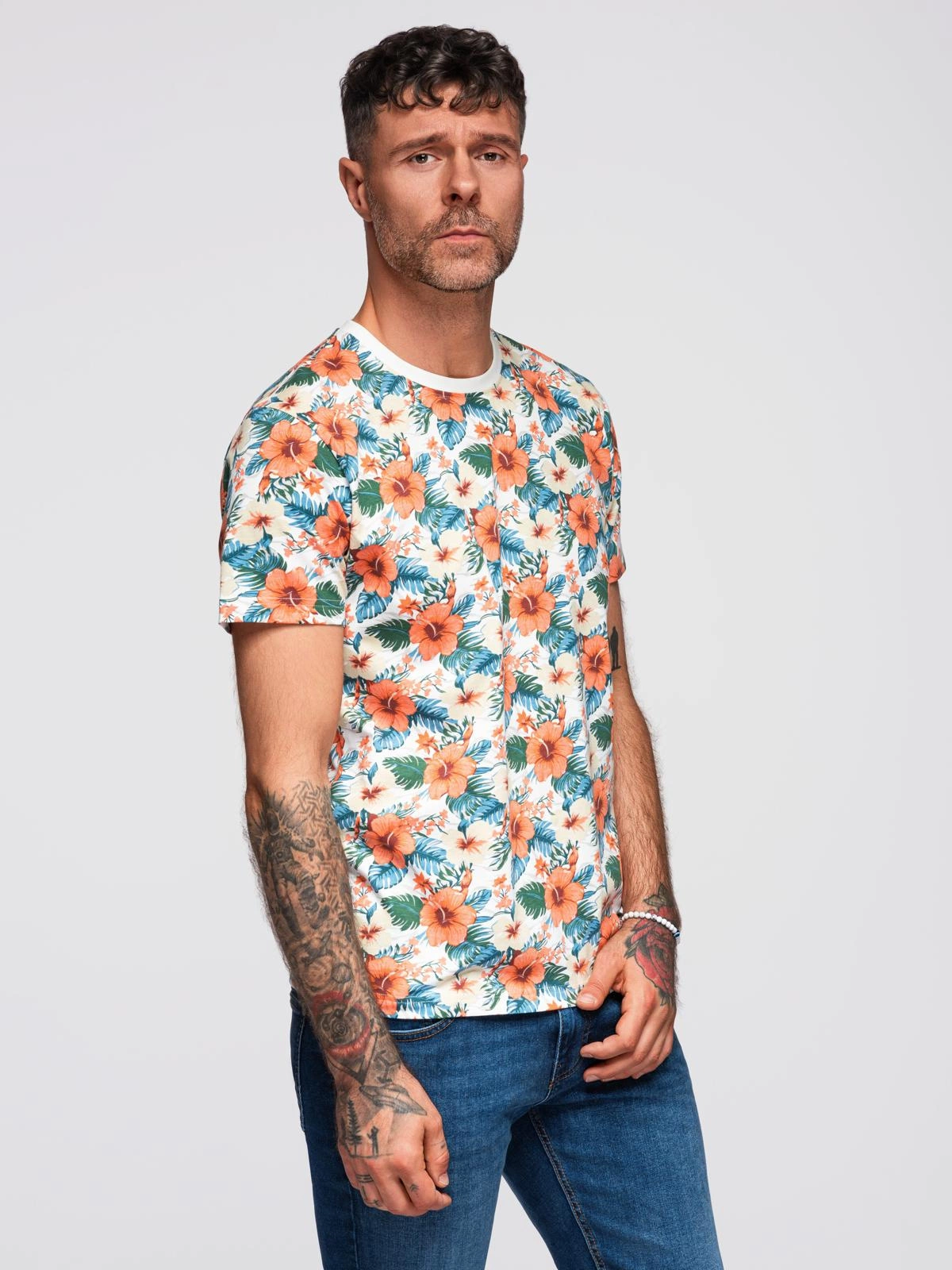 Vyriški medvilniniai marškinėliai su gėlių raštais - balti V1 OM-TSFP-0249