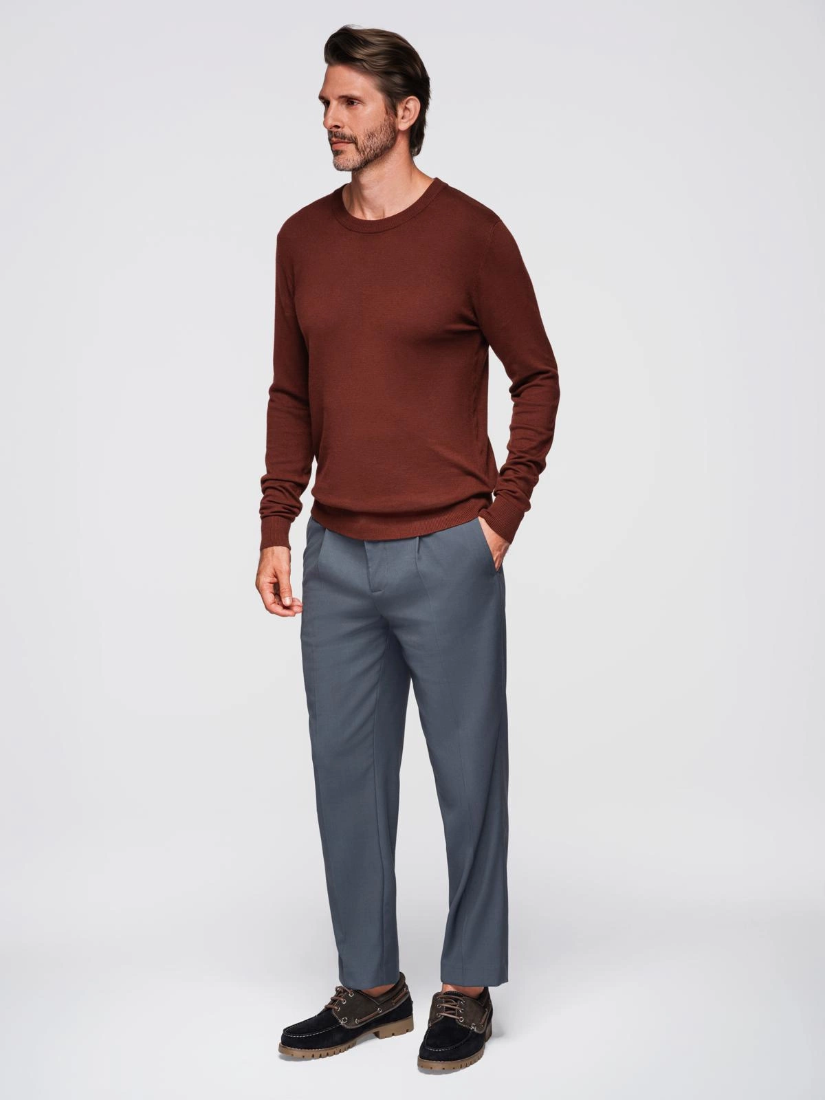 Vyriškas klasikinio pynimo džemperis apvaliu kaklu - bordo spalvos V4 OM-SWSW-0183