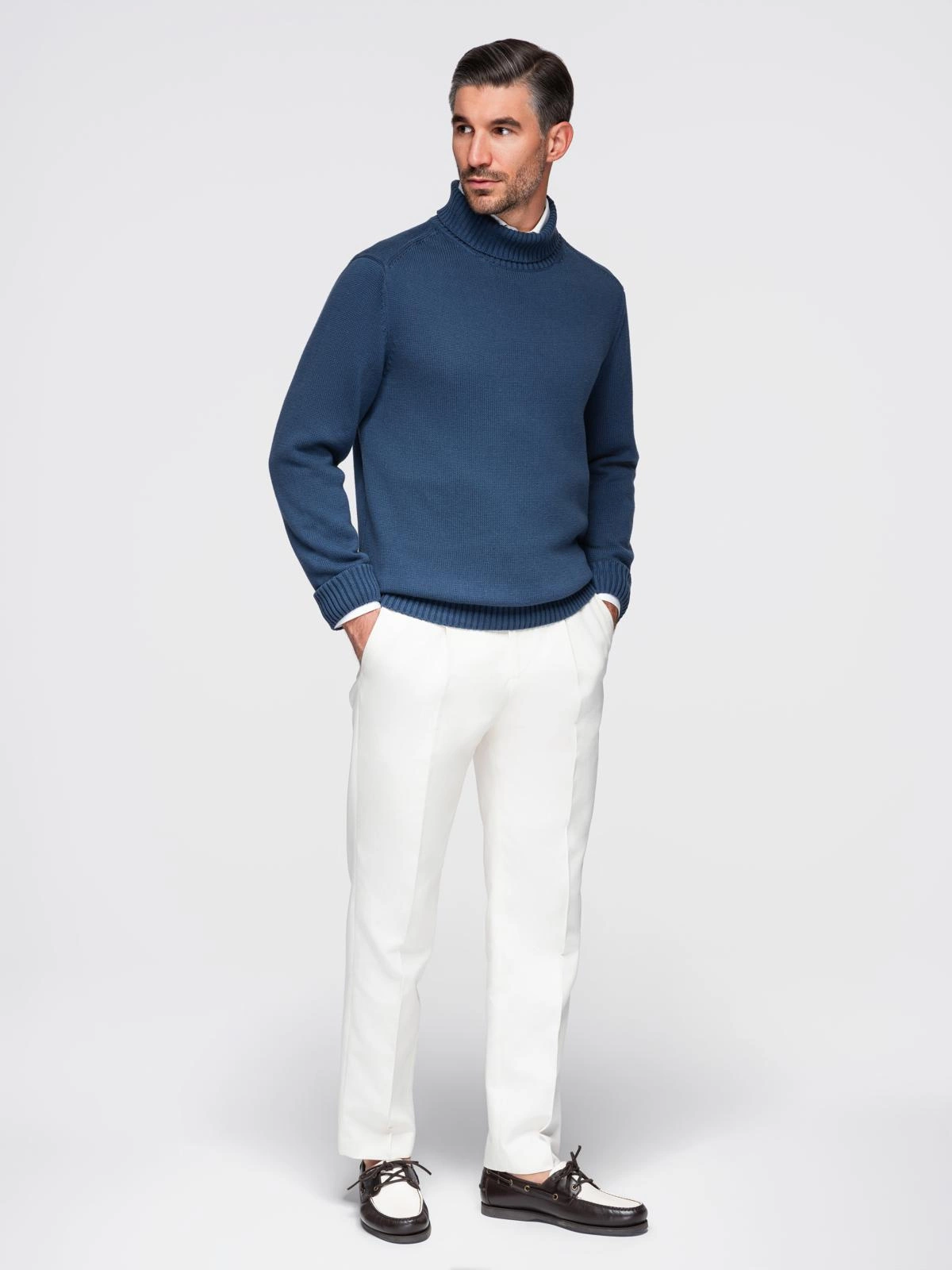 Vyriškas megztas džemperis su golfu - tamsiai mėlynas V2 OM-SWTN-0163