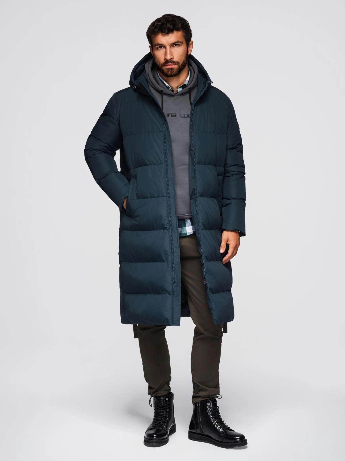 Vyriška klasikinė ilga striukė su gobtuvu - tamsiai mėlyna V2 OM-JALJ-0269