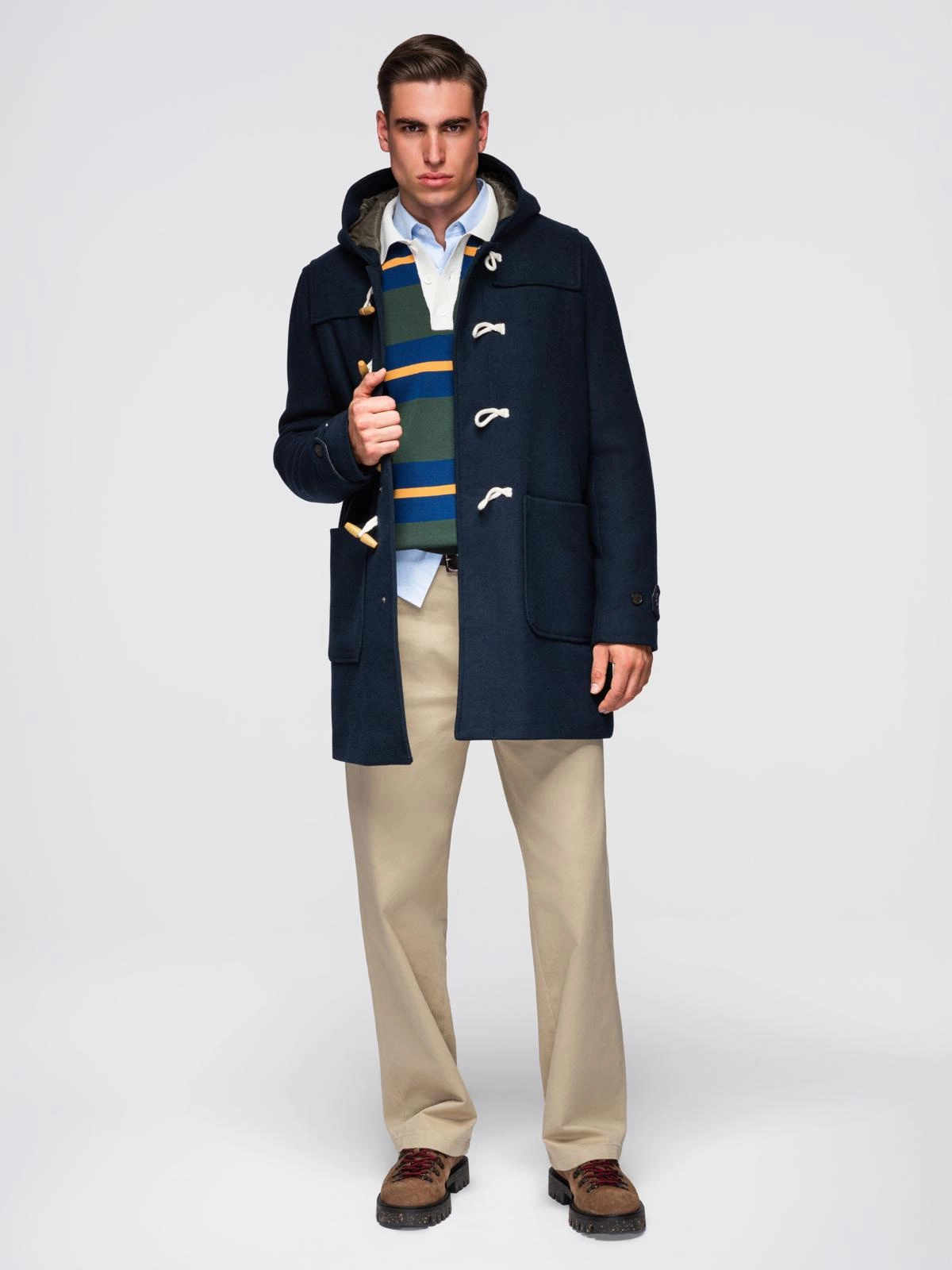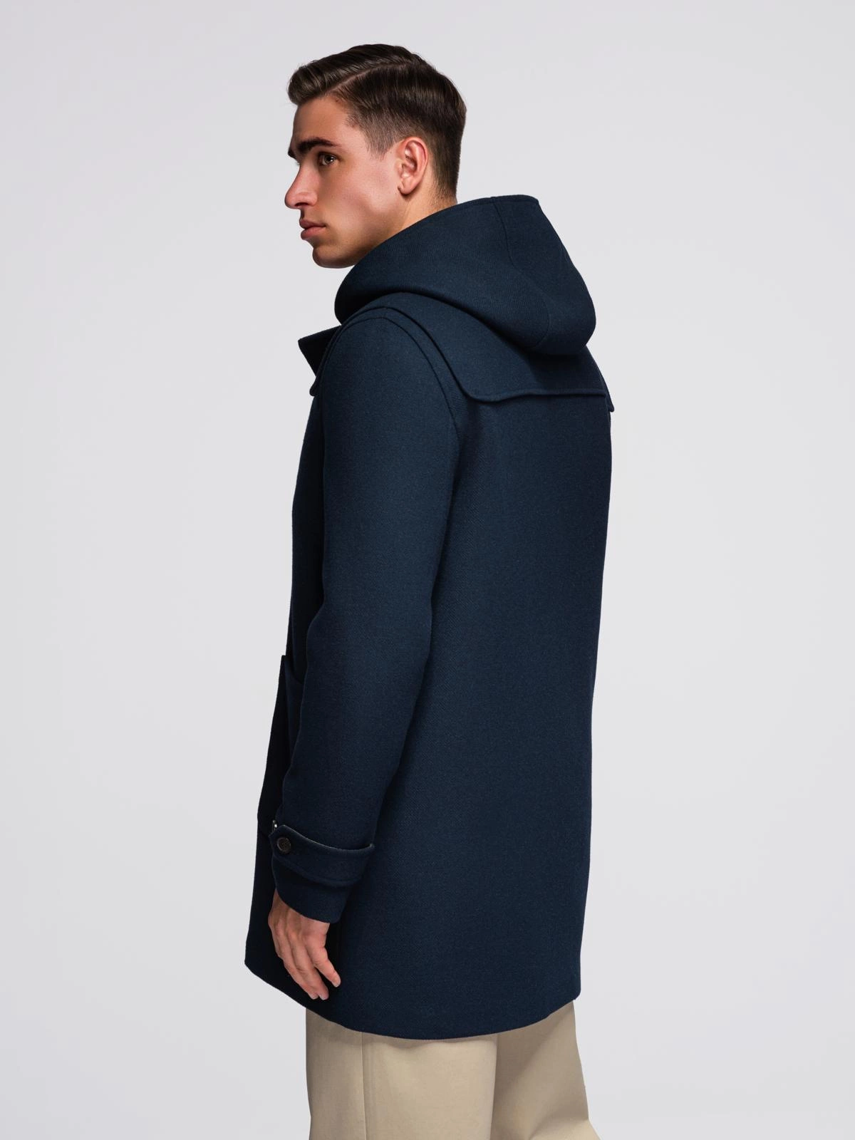 Vyriškas vilnonis paltas su gobtuvu - tamsiai mėlynas V2 OM-COWC-0131