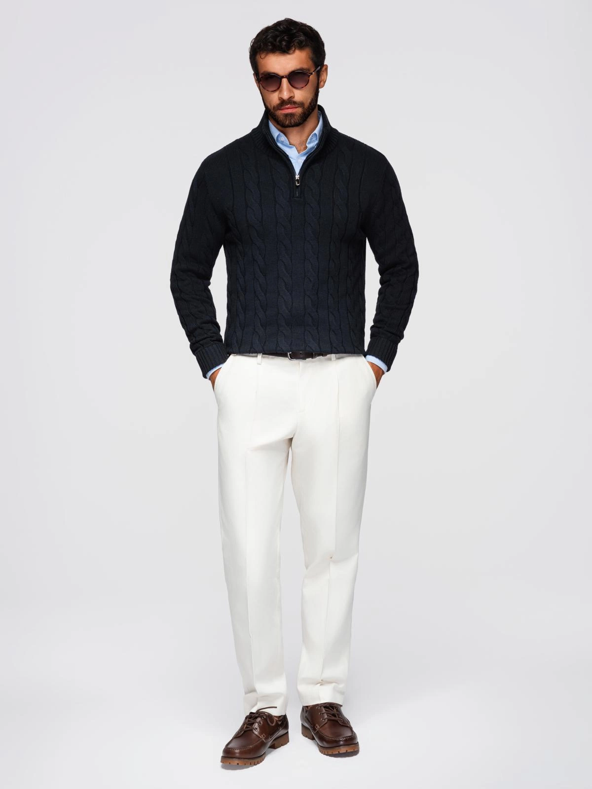Džemperis, kuriame elegancija dera su kasdieniu patogumu. Šis "Quintessence" linijos modelis yra stilingas pasiūlymas vyrams, vertinantiems klasikinį dizainą ir modernų dizainą. Dėl languoto pynimo ir užtrauktuko ties golfu jis puikiai tinka tiek laisvalaikio aprangai, tiek elegantiškesniems deriniams, pavyzdžiui, su marškiniais ir kaklaraiščiu. Įvaizdį užbaigia subtilus metalinis smeigtukas ties apatiniu kraštu.