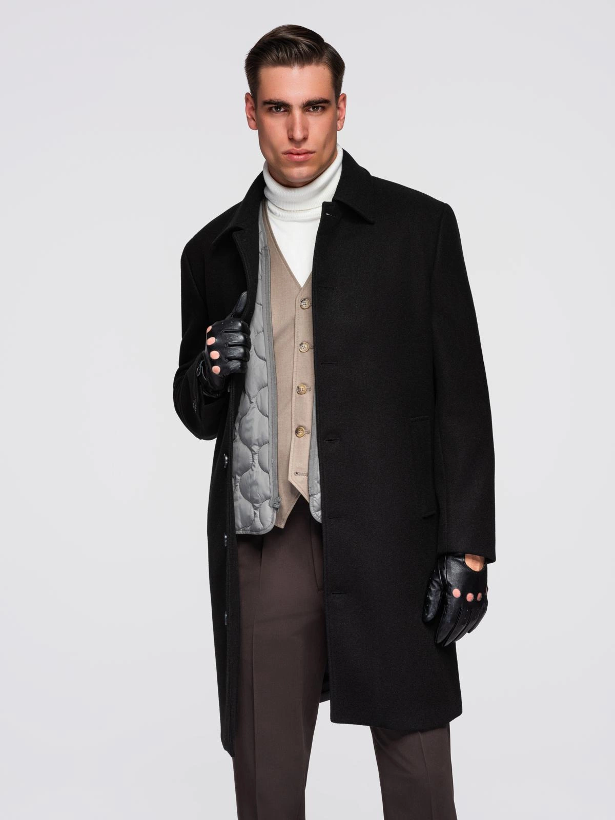 Stilingas paltas su apykakle - unikalus pasiūlymas elegantiškiems vyrams. Jis puikiai dera prie oficialios aprangos, o kasdieniam stiliui suteiks klasės. Vienodos, santūrios palto spalvos leidžia laisvai interpretuoti madą. Po marškinių apykakle galima dėvėti šaliką arba megztinį. Palto praktiškumą užtikrina nuimama, šiek tiek šilta liemenė.