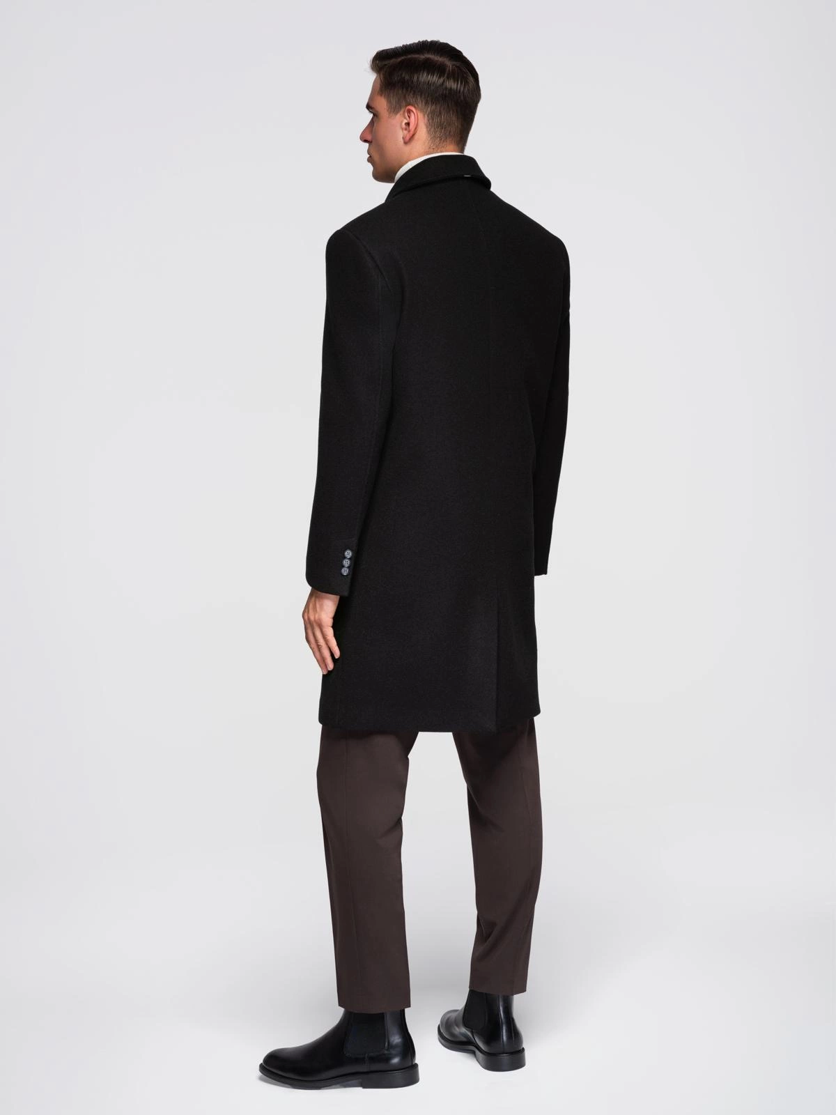 Vyriškas ilgas vienspalvis paltas su apykakle ir apatiniu sluoksniu - juodas V1 OM-COWC-0135