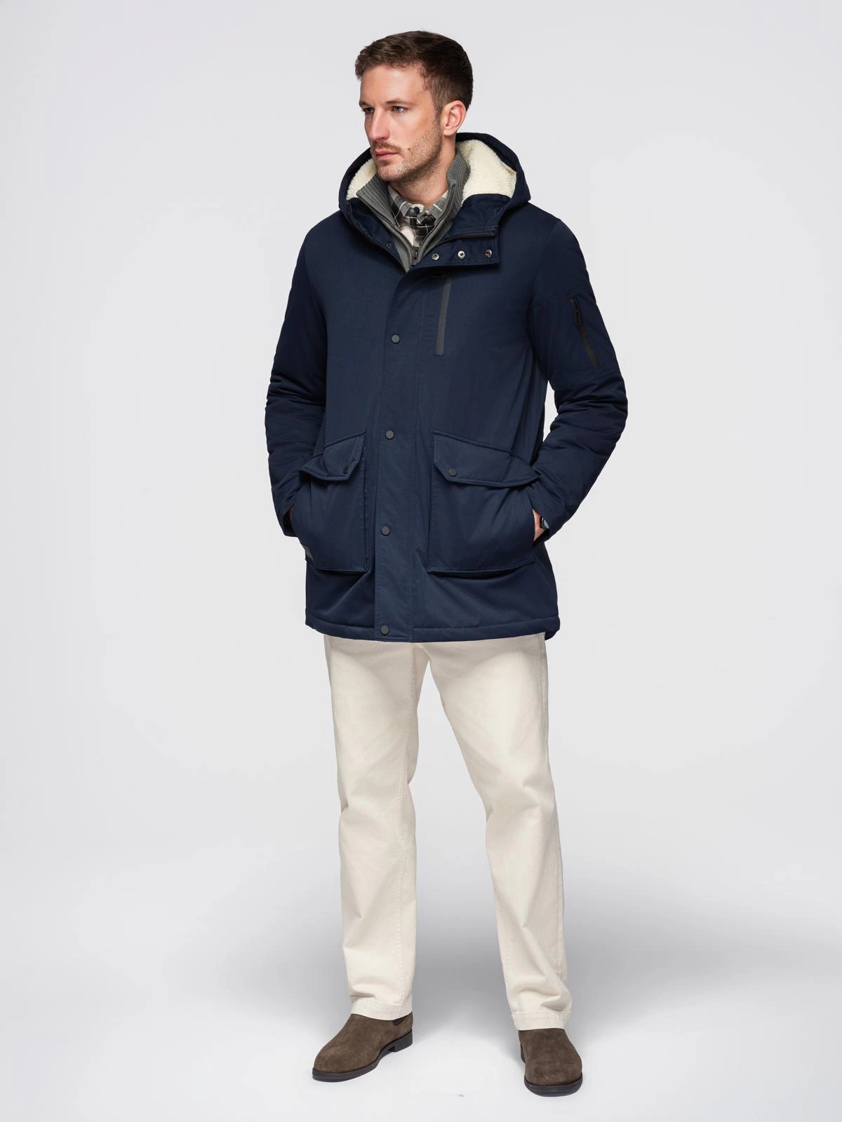 Vyriška ilga striukė su avikailiu - tamsiai mėlyna V2 OM-JAPJ-0316