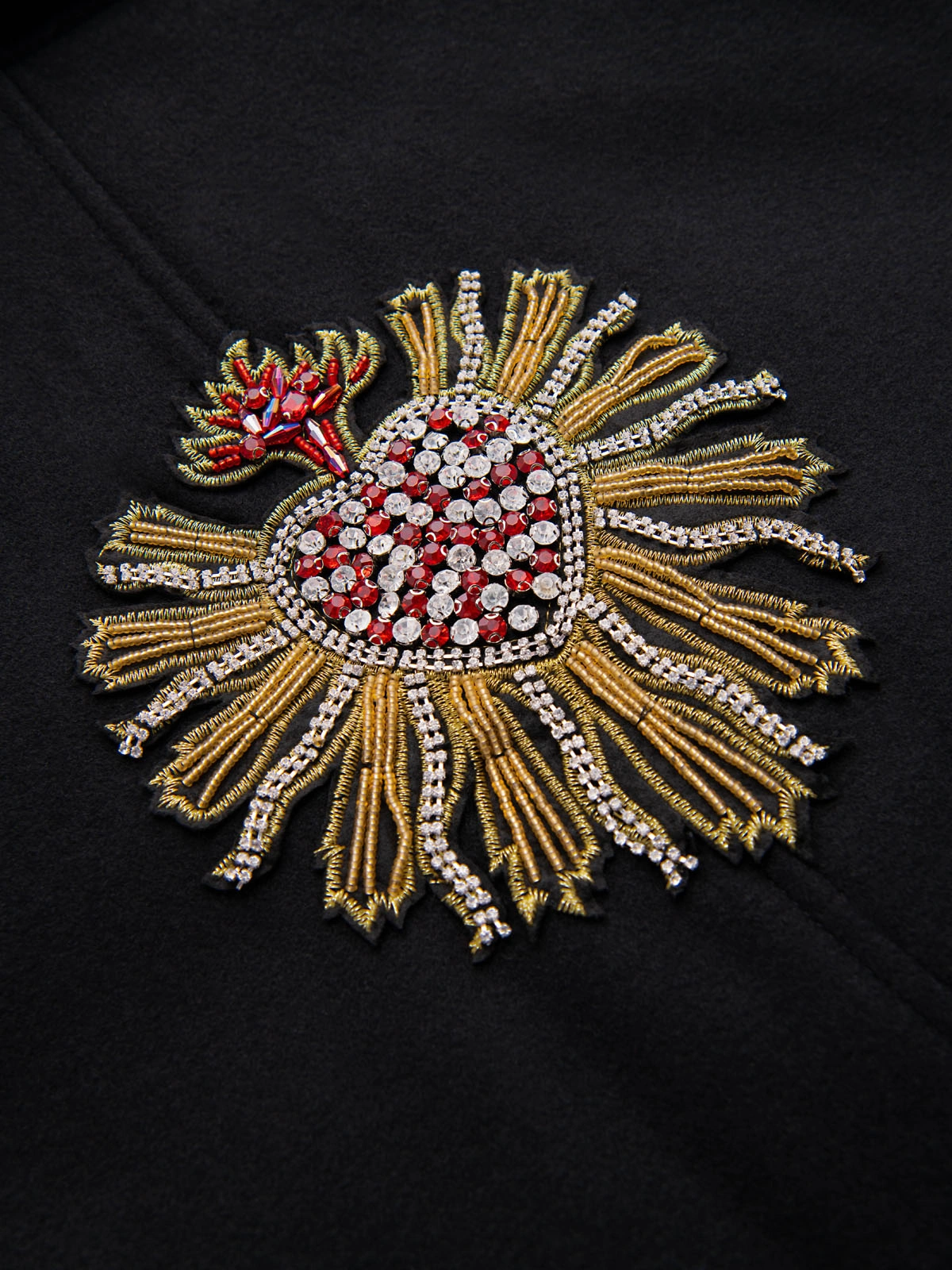 Vyriškas paltas iš "Heritage" linijos, taisyklingo kirpimo, pasiūtas iš lygaus audinio. Modelis su dviviršeliu auksiniu sagų užsegimu su herbo motyvu, užtrauktuku nugaroje ir plačiais apykaklės atvartais. Išorėje - dvi šoninės kišenės, viduje - praktiška kišenė ant krūtinės. Viduje - žakardinis dygsniuotas pamušalas. Visas drabužis lengvai paminkštintas poliesterio užpildu. Priekyje ir nugaroje yra dekoratyvinių karoliukų aplikacijų.