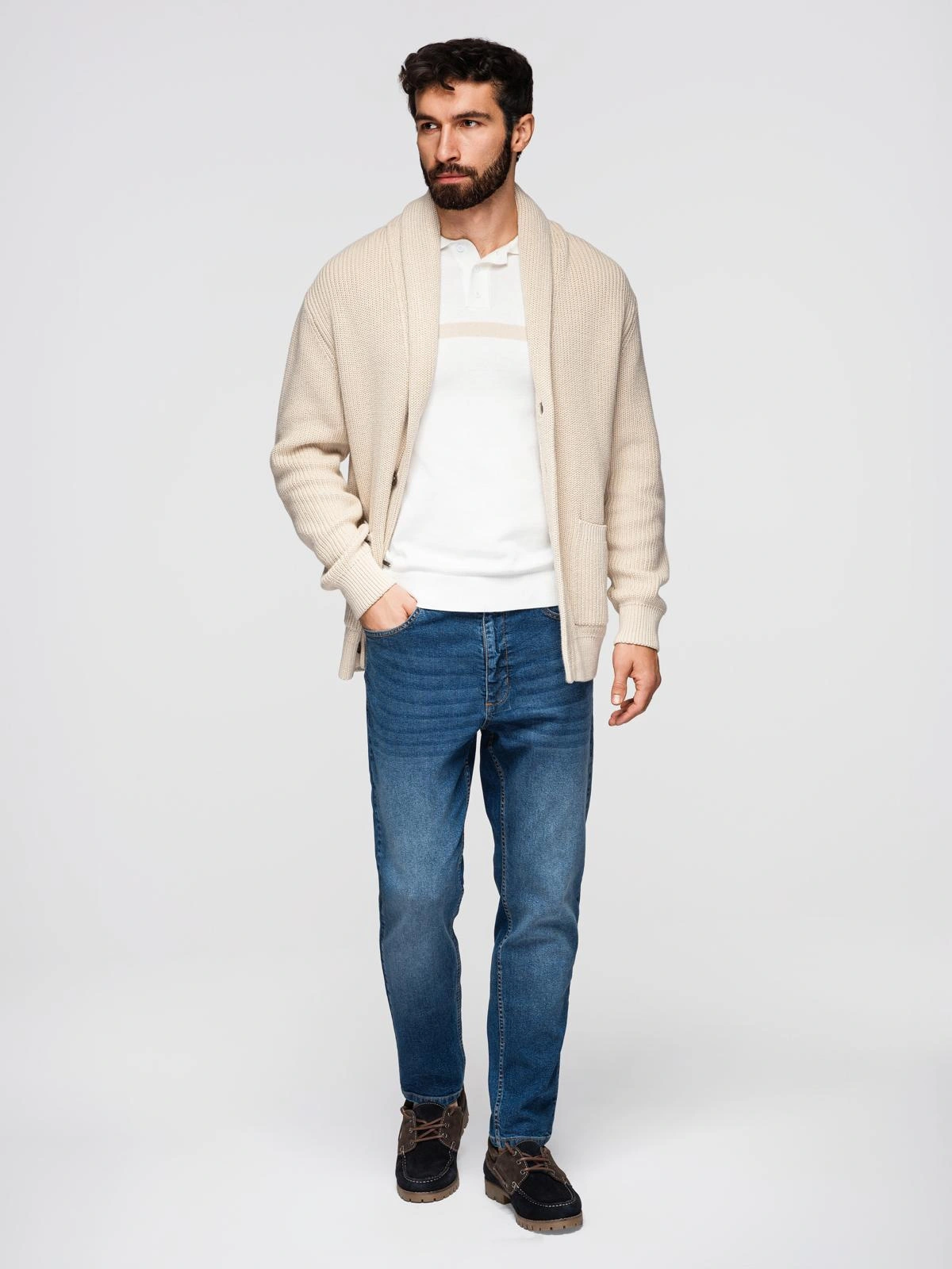 Vyriški džinsai iš "Ombre Denim" linijos su morkų kirpimu, t. y. patogesniu šlaunies srityje ir siaurėjančiu apačioje. Pasiūti iš elastingo austo džinsinio audinio su skalbimo efektu ir kontroliuojamu trynimu. Priekyje - dvi įdėtinės kišenės, nugaroje - dvi praplatintos kišenės, vidinės kišenės maišeliai iš medvilnės. Metaliniai priedai ir odos imitacijos lopas ant galinės kišenės.