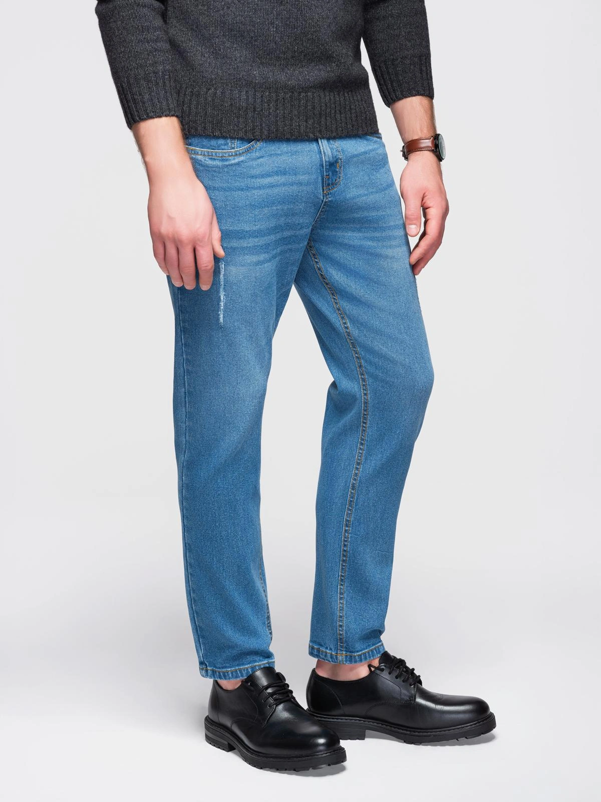 Vyriški džinsai iš "Ombre Denim" linijos, reguliaraus kirpimo, pasiūti iš šiek tiek elastingo austo džinsinio audinio. Elastano mišinio audinys užtikrina prigludimą ir išlaiko formą. Apdaila apima džinsams būdingą trynimą. Modelyje įrengtos dvi priekinės ir dvi užpakalinės kišenės; patogumo suteikia medvilniniai kišenių maišeliai. Naudojamos metalinės sagos ir kniedės, dirbtinės odos lopas ir maža austinė etiketė prie vienos iš galinių kišenių.